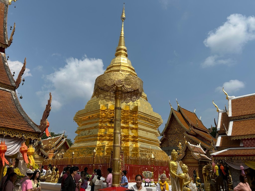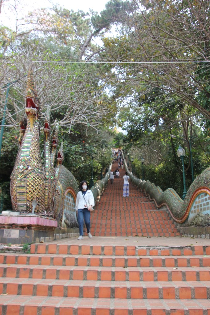 Our second stop of the day was the Doi Su Thep temple on a mountain overlooking Chiang Mai. We climbed the 309 steps to the temple occasionally using the snake’s tail as a railing. The climb was steep and we were grateful that the temperature was only 29C.