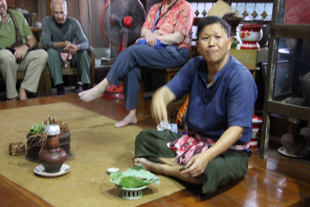 Joe taught us how they traditionally make tea. He showed us how to take some fermented assam black tea, add a grain of salt to make a good chew. It was surprisingly tasty. More so than his second offering of chewing betelnuts. We were shown to take a Pann leaf, add some dried betelnut, some tree bark and sap from a specific tree and, after wrapping it into a small bundle, chew it without swallowing it. We were encouraged to spit it out. The taste was sharp and unpleasant and left our mouths numb but is supposed to give an energetic boost. It is definitely an acquired taste, that if acquired can lead to addiction or cancer.
