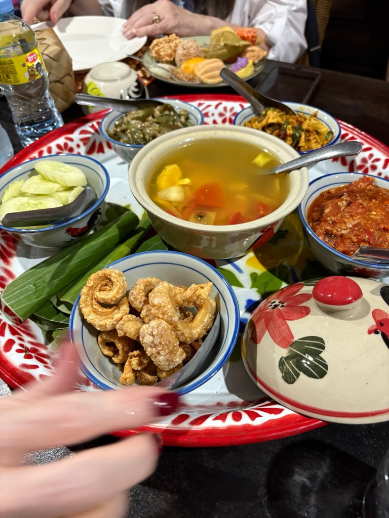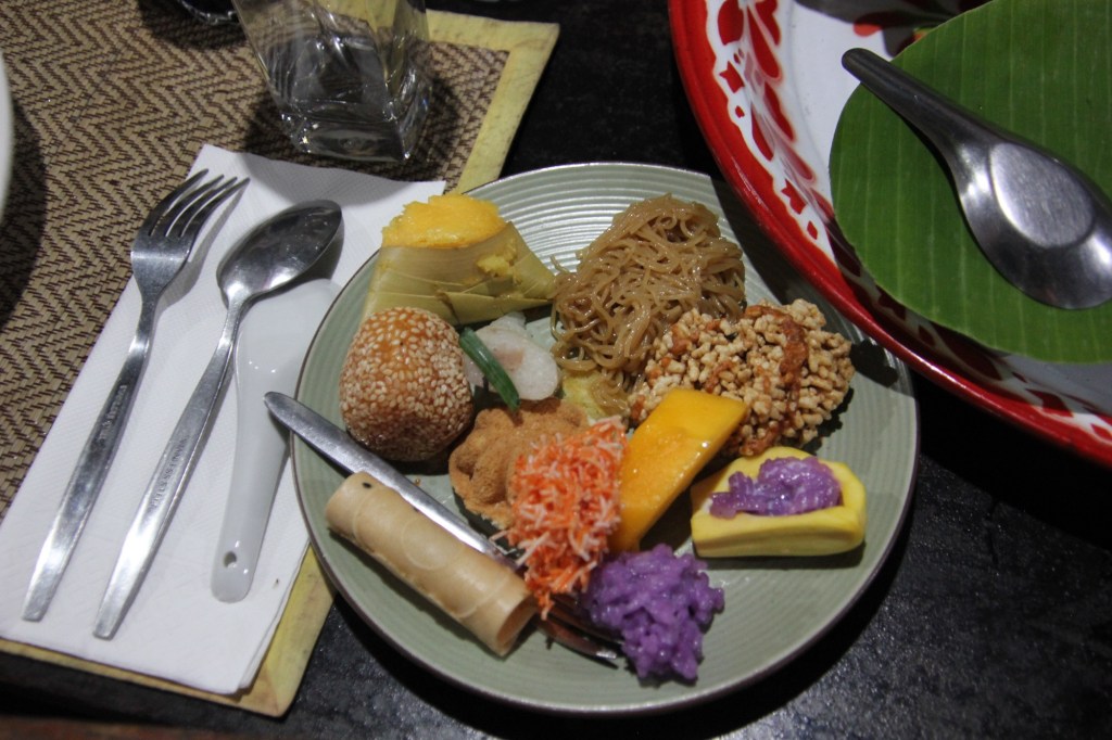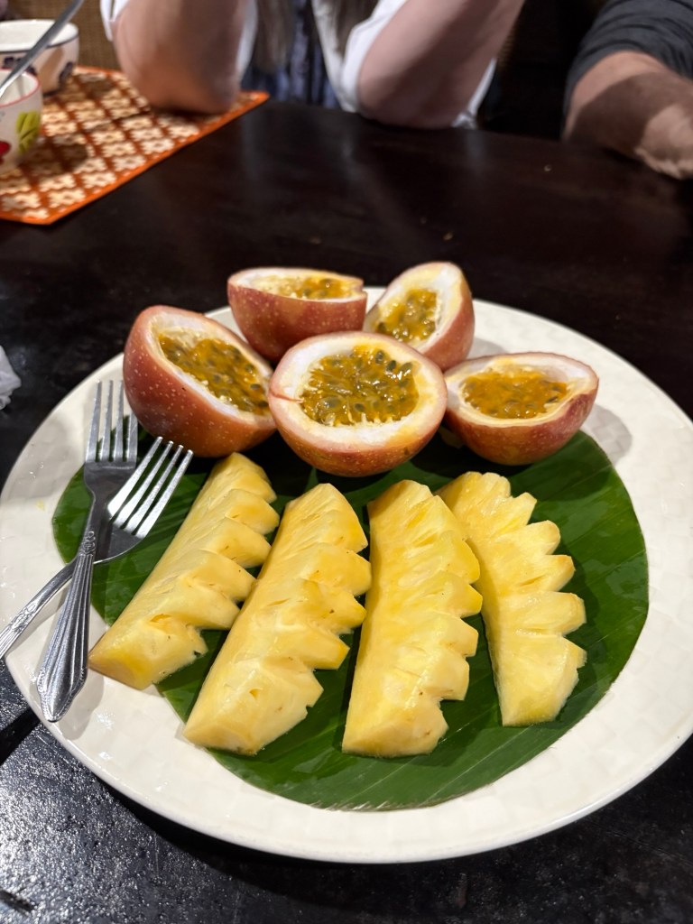 We were invited to join the family for dinner. The food was varied with lots of choices. We had a huge variety of appetizers followed by a main course composed of several dishes and desert- bananas in coconut milk accompanied by fresh passion fruit and pineapple. As we finished our meal our hosts gave us a parting gift of fresh tamarind seeds (delicious once you figure out what parts to eat/not eat).