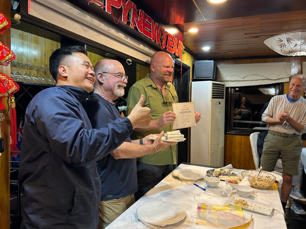 We ended our day with happy hour (2 for 1 drinks are never dangerous) and supper. However, before supper the men in our group were challenged in a spring rolls making contest. The good news was that Greg was declared Master Chef in charge of spring rolls with a certificate to prove it.