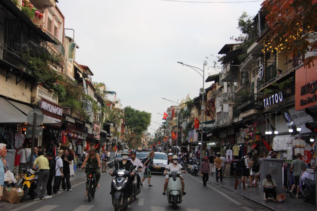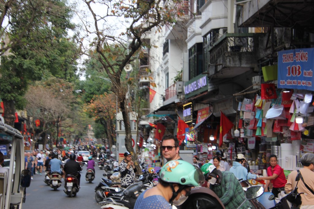 We immediately went for lunch at a local restaurant. It was our first opportunity to deal with crossing roads in Hanoi. Our guides encouraged us to be like “sticky rice” as we waited for a lull in oncoming traffic. The idea is to find the gap, walk slowly and confidently across traffic and expect people on scooters or in cars to go around you. So far so good!