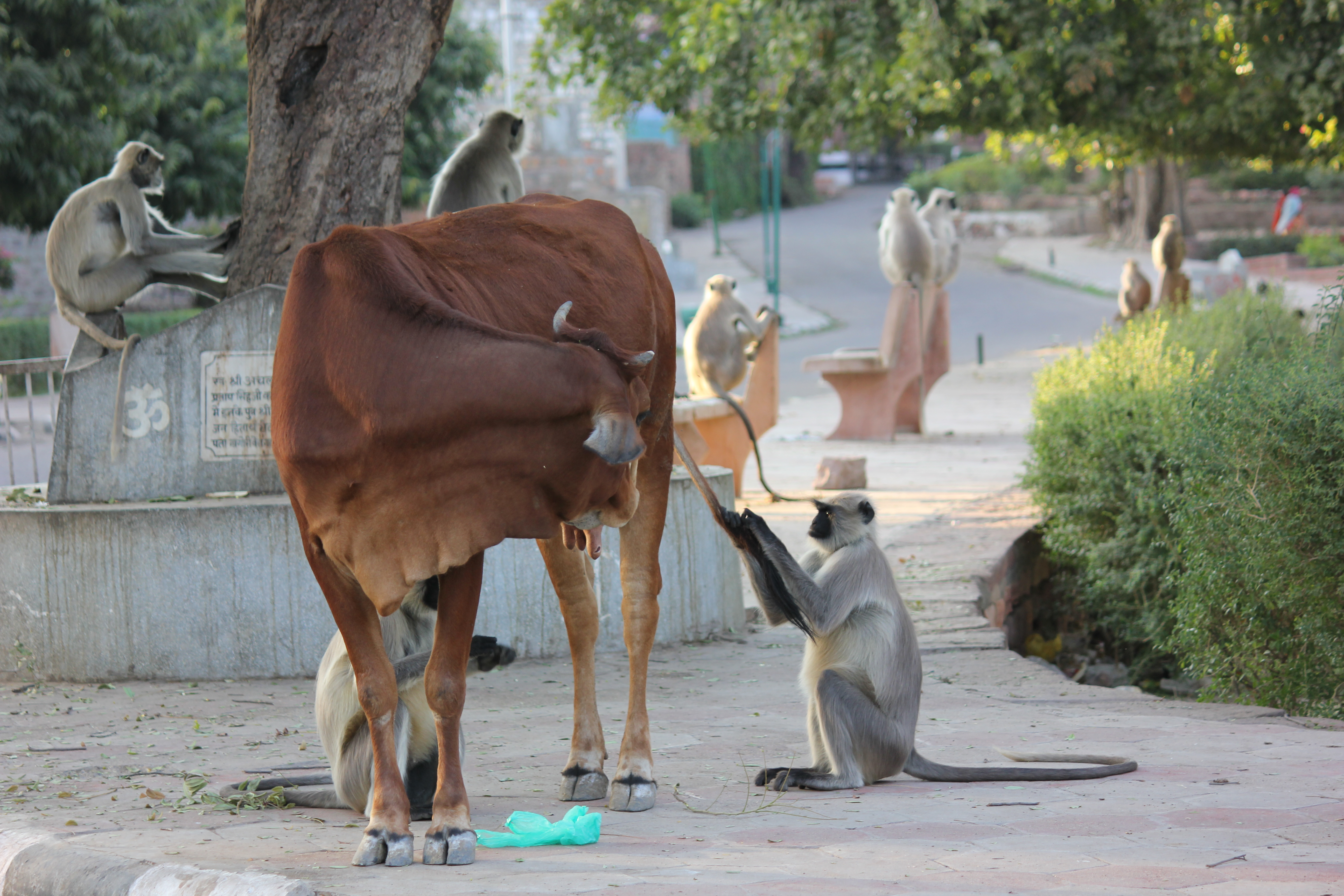 Yesterday we encountered monkeys in a memorial park. We went for a walk and found a huge group of monkeys hanging around. it was a little strange being so close to them. They were non-aggressive and tended to avoid us. It was fun to watch them play, It was also clear how strong they are. We kept our distance. We particularly enjoyed the monkey that was grooming the cow!