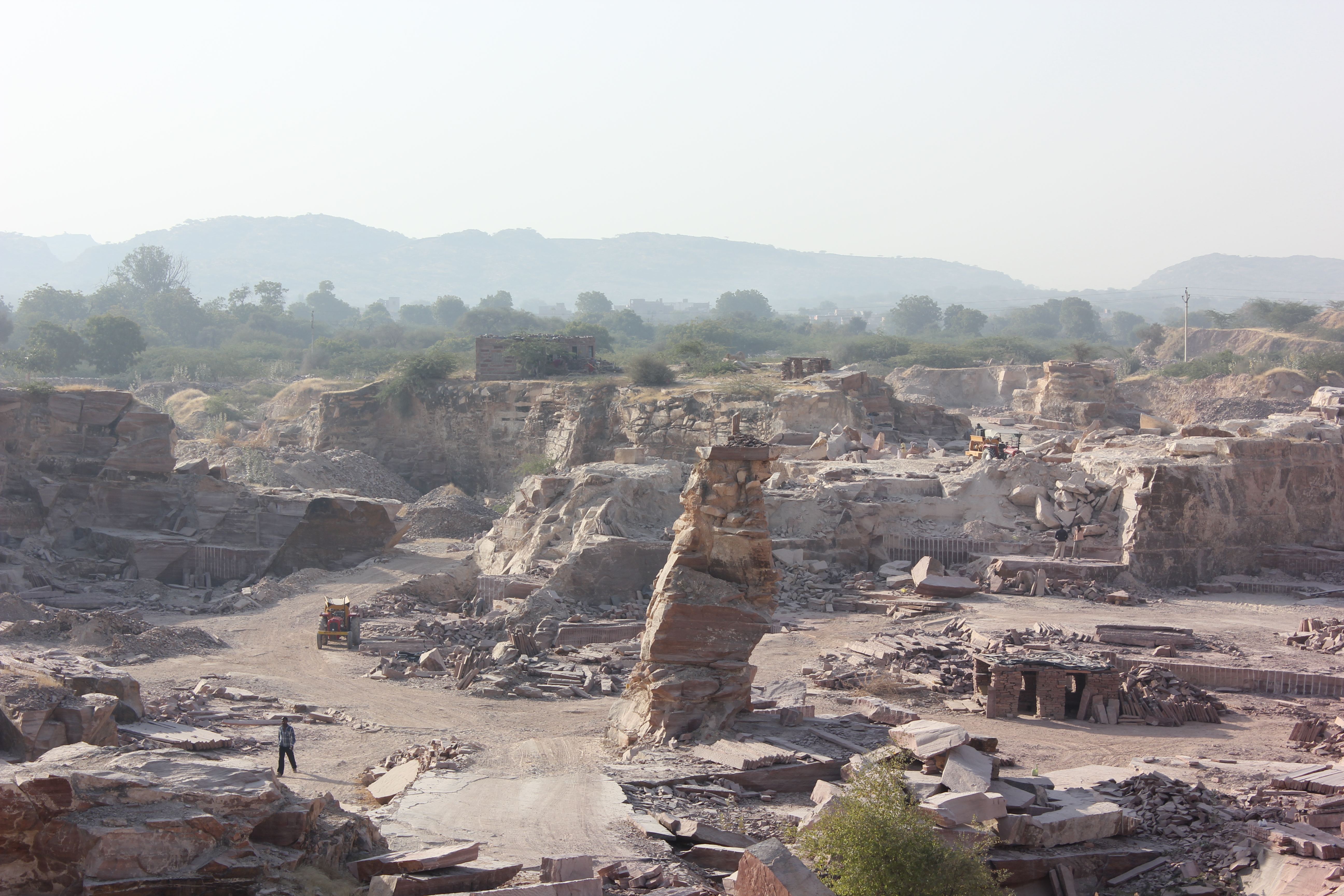 Today we met camels, goats, water buffalo and cows on the road. Wild camels were a common feature standing beside the road or roaming off in the distance. We also moved from granite in Jodhpur to red sandstone. We stopped briefly at a sandstone quarry and watched them cut stone from the ground.