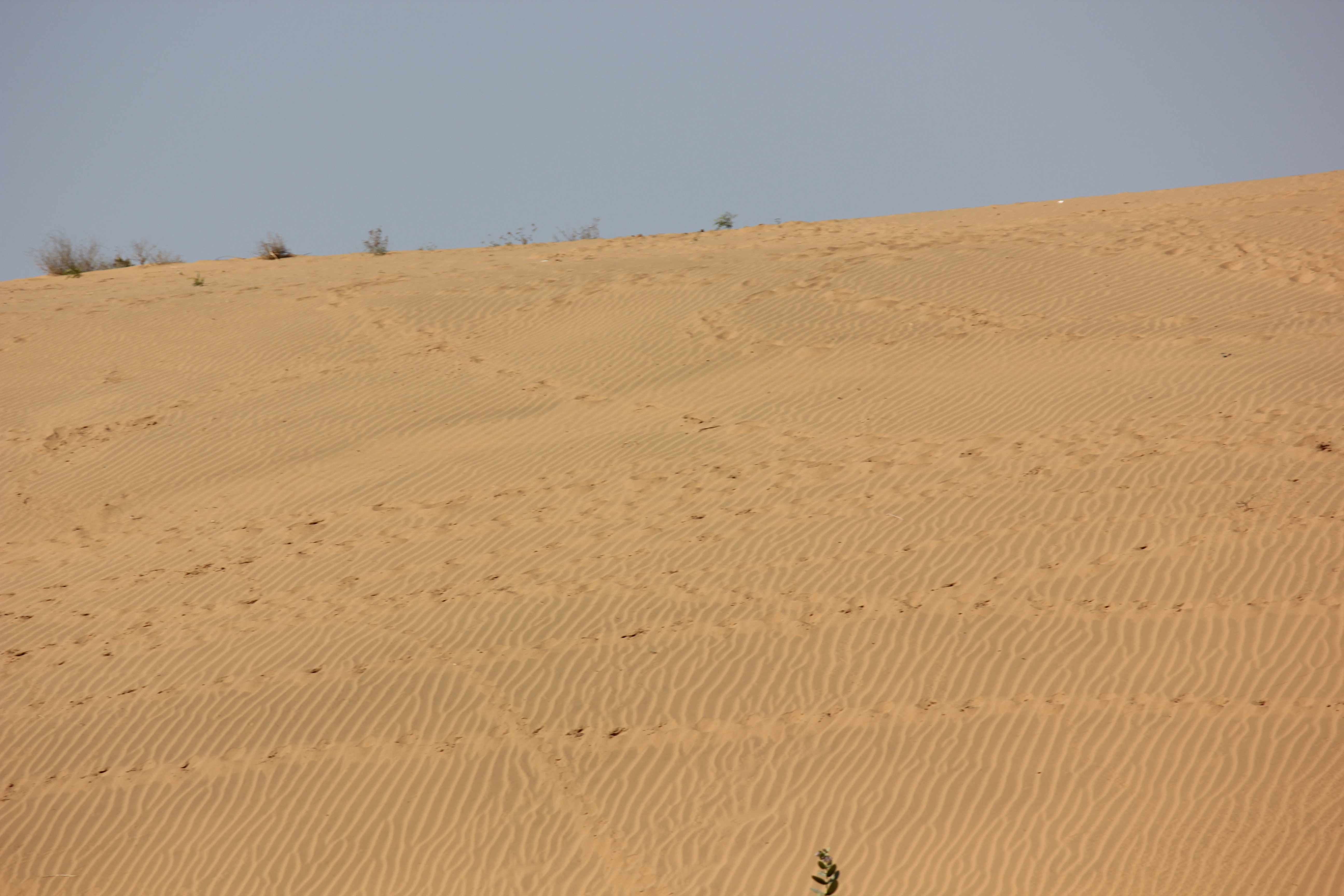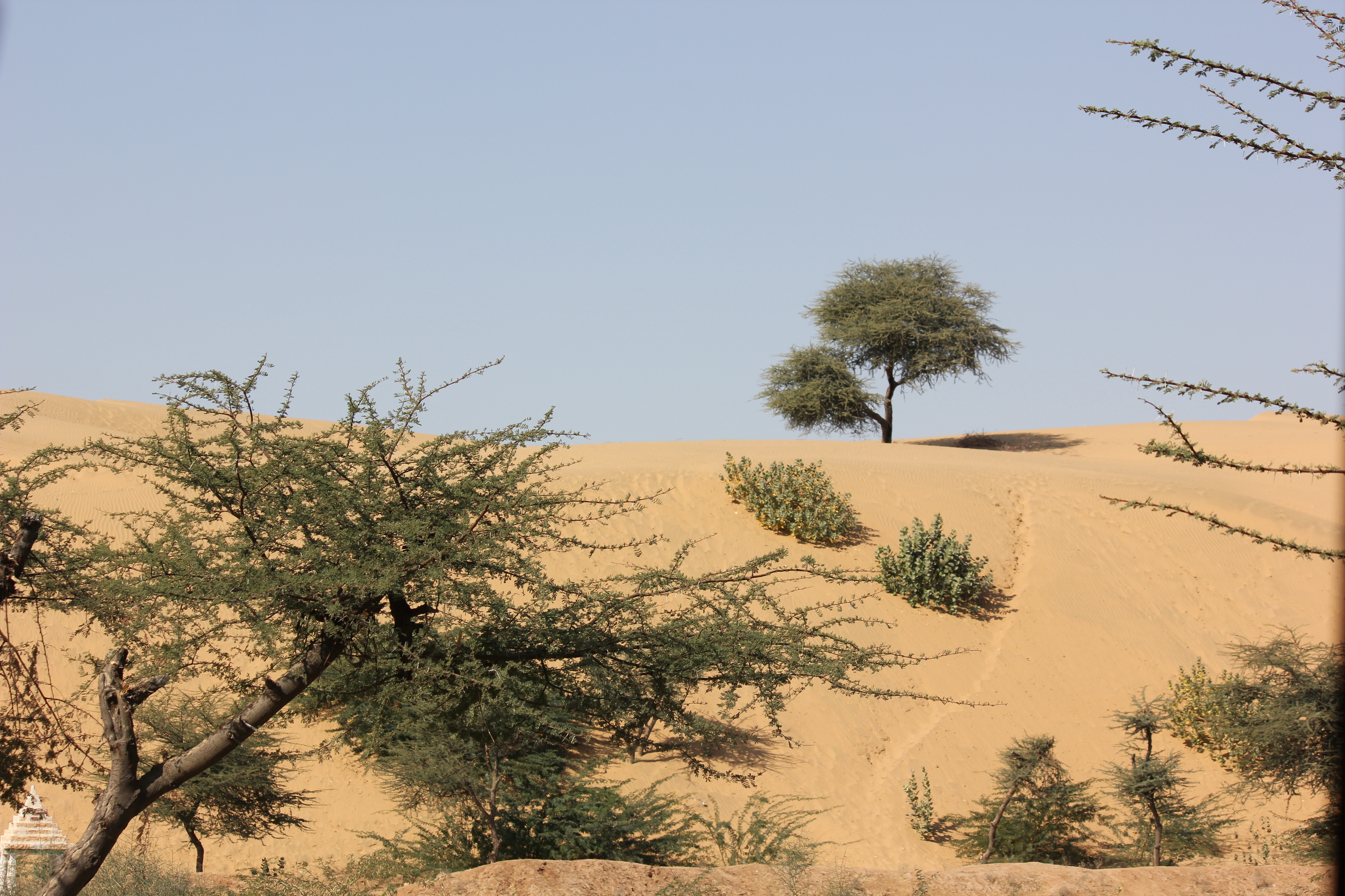The fact that we were travelling through desert became very apparent when we encountered sand dunes. We saw many trees without any undergrowth. The villages had different kinds of house/huts and there were relatively long distances without people (i.e., three or four minutes). The road suddenly got very smooth about one hour outside of Jaisalmer. We eventually figured out that a prime reason for this was the presence of a huge military base. It covered at least 40 km. The tension between India and Pakistan is ongoing. There is no passenger air traffic into Jaisalmer because of this. The only airplanes belong to the military.