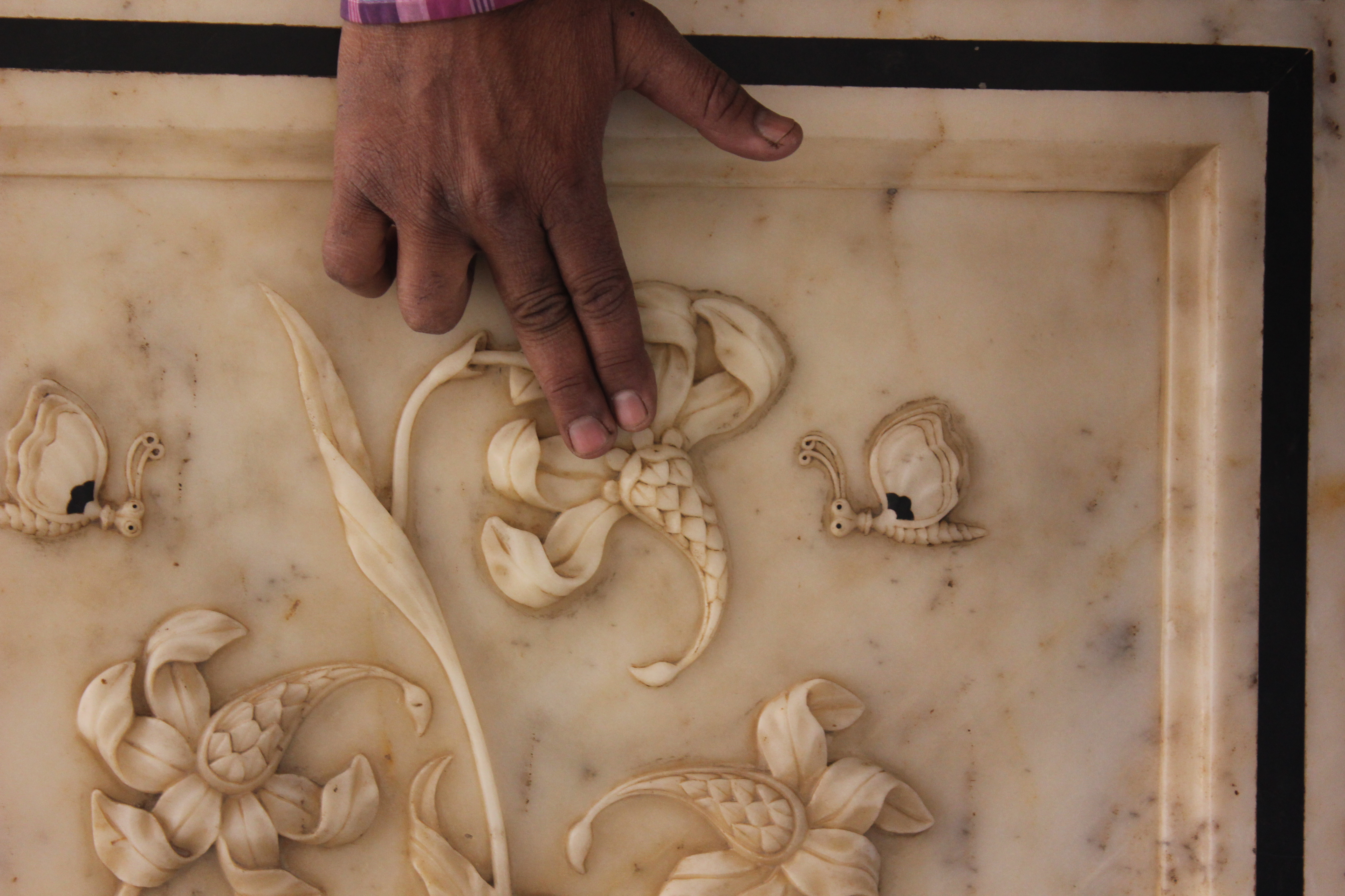 We explored the palace with our guide. The decorations in the presentation area were remarkable. The walls were covered with mirrors so that it would be a bright place. The columns were decorated with carved marble. The carvings were like those in the Taj Mahal, however, the flowers were symbolic and many had pictures within pictures.