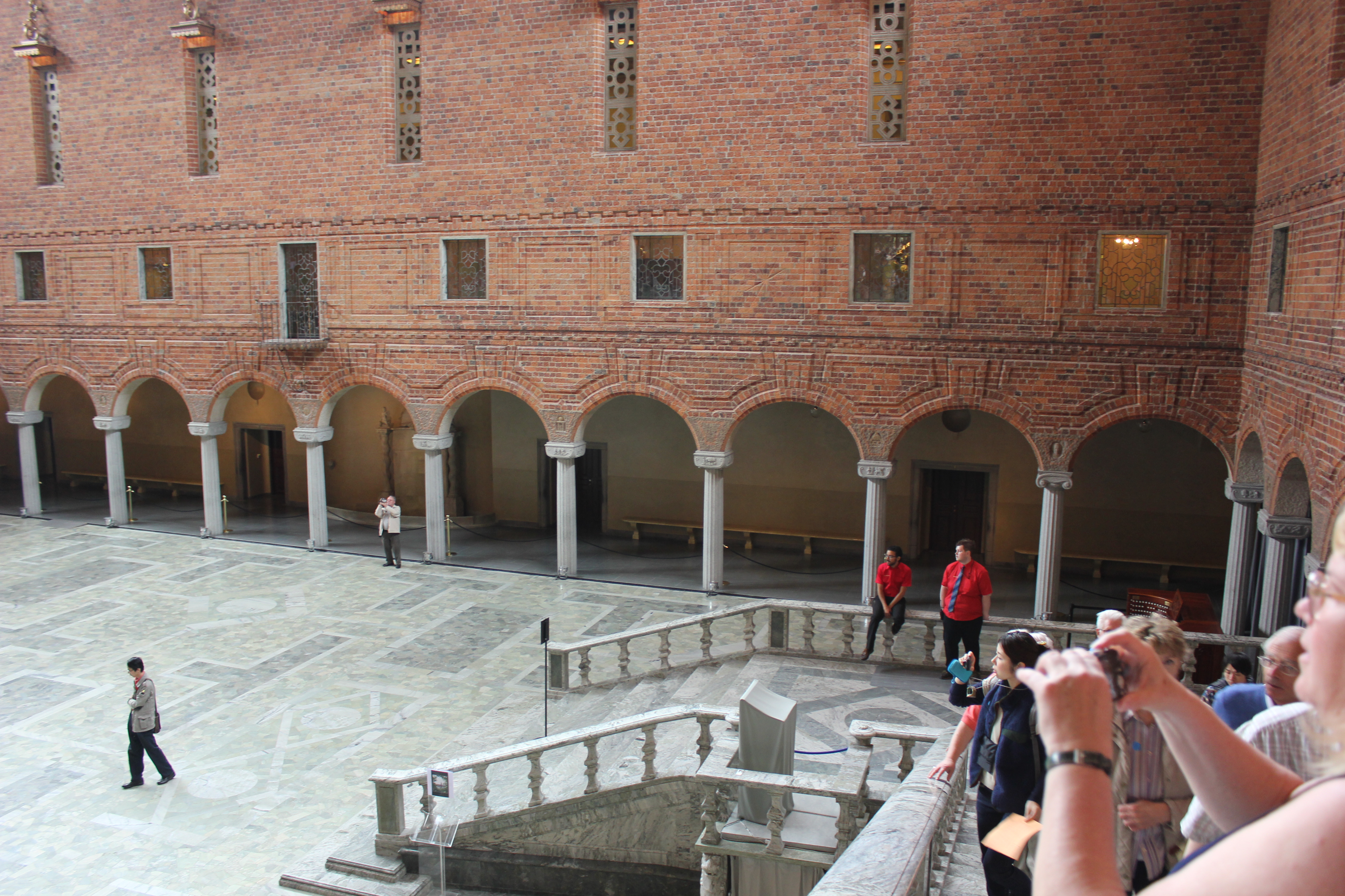 Today was a day of wandering from the “here and now”, to the “there and then” and back again. We started our day with a trip to the Stockholm City Hall. OK, not high on everyone’s list but… When I was here in 1980 I went to a banquet in this very hall. The Rotary Club was having its 50th anniversary and the King of Sweden, who was a member of the Rotary Club, hosted a gala for 1200 guests at the City Hall. Imagine having the opportunity to be in this amazing place, wearing my graduation dress for the second time, for such a grand event! It was incredible being back in the same rooms now. I didn’t remember everything but a lot came back as we walked around the Blue Room (that has absolutely no blue in it) and then the Gold Room (made entirely of gold/glass mosaic tiles). We had to imagine what it was like when all the tables were set up everyone had the same silverware, china and crystal glasses (imagine washing those dishes by hand) and all of us exchange students got to meet the King. The dancing was held in the gold room. Well, the king wasn’t there today and there was no orchestra but it was beautiful and still a special place for me (Dale thought it was OK too).