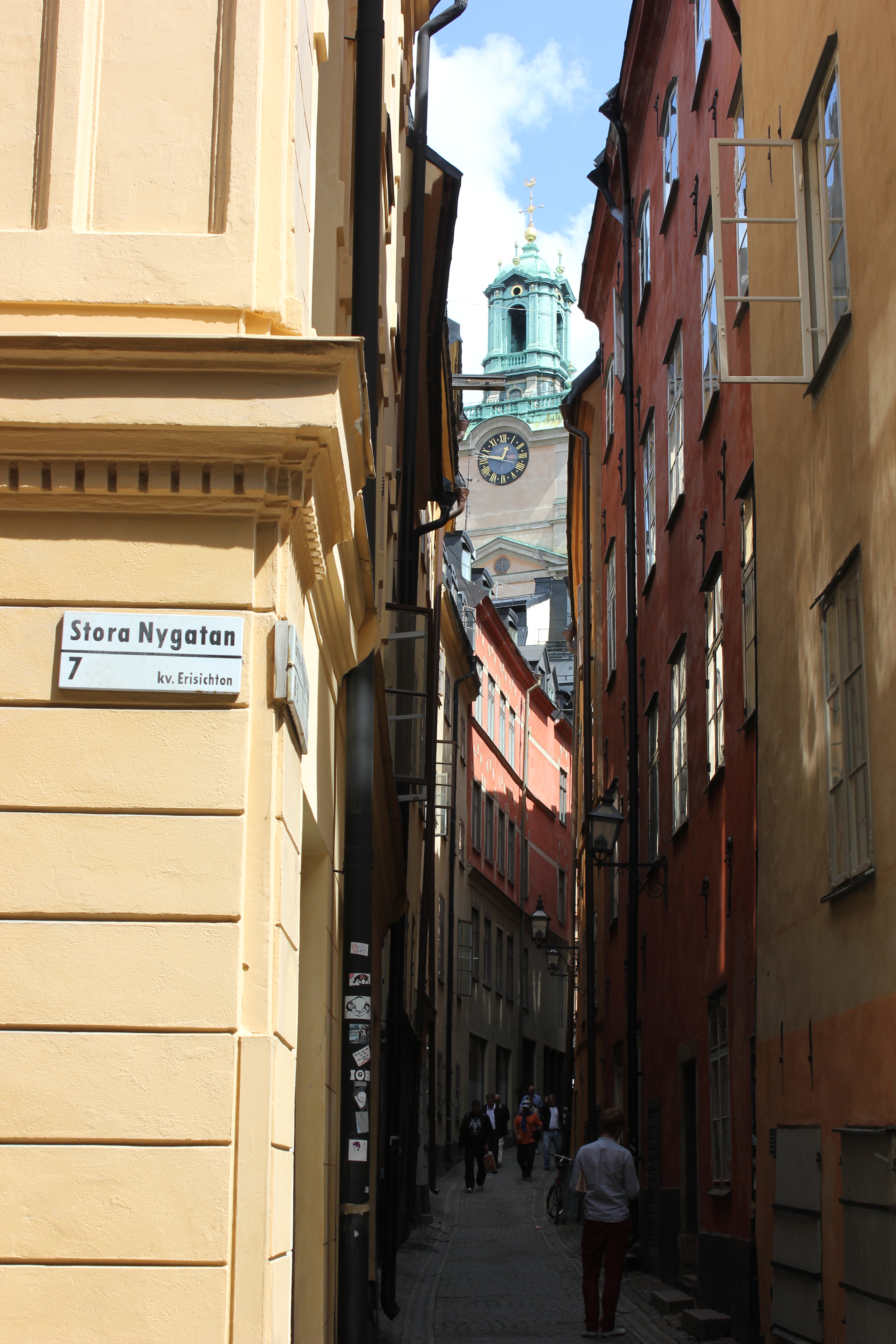 After our tour we headed off to Gamla Stan or the Old City. It was on a different island. Stockholm is made up of a bunch of islands of differing sizes all connected by bridges. We found a place to have a drink and plan our path. We enjoyed the beer (to be exact it was Hobgoblin ale) and decided not to plan and to simply wander. We found all sorts of quaint stores and souvenir shops. We couldn’t go into a few because they posed a threat to Dale’s head. Many of the buildings were built in the 1750’s or so, and people were shorter then! We ended up wandering through the grounds of the King’s Palace. We had a bit of fun finding out where to buy tickets. Once again we admired the high ceilings and staircases in the palace, as we walked up and down the stairs twice to finally figure out where the tour of the treasury was happening (underground in the vault) and where the tour of Three Crowns was going to be (down a different set of stairs). We didn’t have time to see the whole palace but we did get to see most of the below ground parts. The guides made everything very interesting.