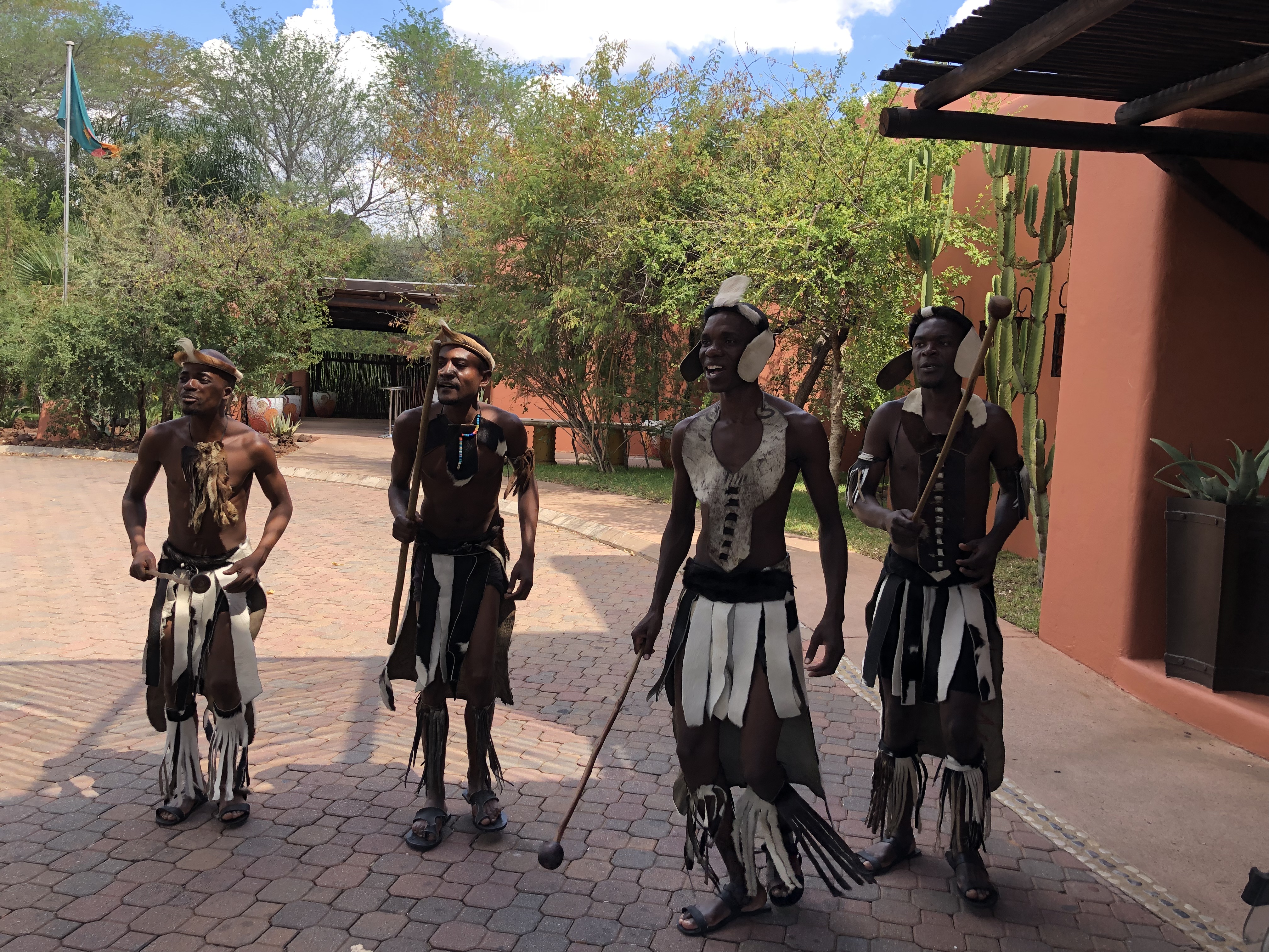 It was the mist from Victoria Falls. We landed and stood in line for an hour to get a visa that would allow us to travel to Zimbabwe and Botswana should we choose. Then our cab driver, Ali took us into town. This community was much more European (read lots of strip malls on the main road) than Tanzania. We reached our hotel, which is in a protected park. The families of giraffe and zebra we passed as we entered the grounds ignored us. these guys greeted us with song and dance.