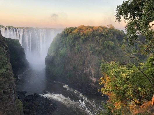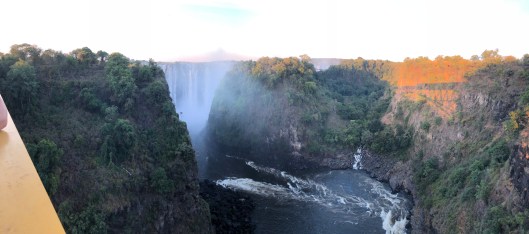 The falls are 1.7 kilometers wide. Despite this being the time of year when the falls should be at their peak, the drought conditions were evident. We should not have been able to see the rocks at all but, as he pointed out, the rainy season hadn’t come as far inland as it needed to. The falls were breathtaking. We had been warned about the mist and the desk gave us plastic ponchos. I had left my camera in the hotel to be on the safe side. I was glad I had! The “mist” was like walking through a warm rain. We got soaked. Elvis was great at taking panorama pictures on iPhones and so, gave us free photography lessons too. As you can see from the pictures, the falls were amazing. The rainbows were circular at some points. We thought lovingly about my sisters (because they love heights sooo much!) as we walked across the Knife Edge bridge over the river. The bridge was slimy from moss thriving in the misty conditions and bouncy as we walked over the gorge. The view of the falls changed with every turn of the path. Elvis told us we just missed the full moon over the falls and the ceremonies that occurred. He spoke of about Nyami Nyami, the spirit of the river. The spirit is usually seen as a snake and is considered a God by the local people and controls life in and around the river. The building of a hydroelectric dam in the 1960’s changed the way of life for the Zambian communities who had always lived close to the river. Elvis described some of the changes that had occurred.