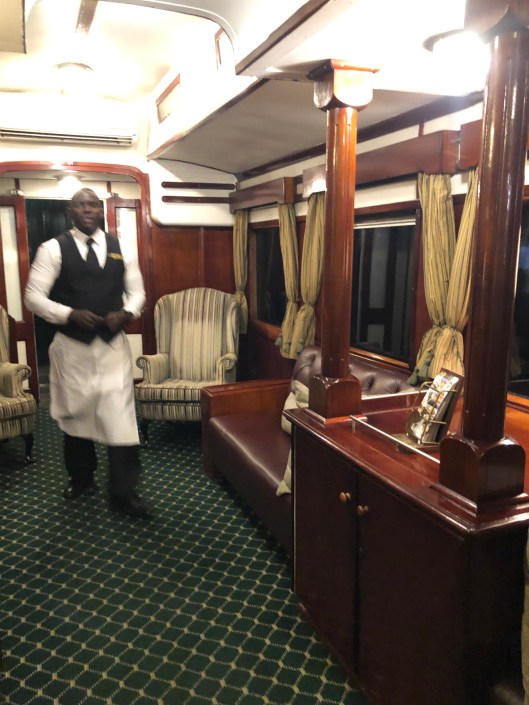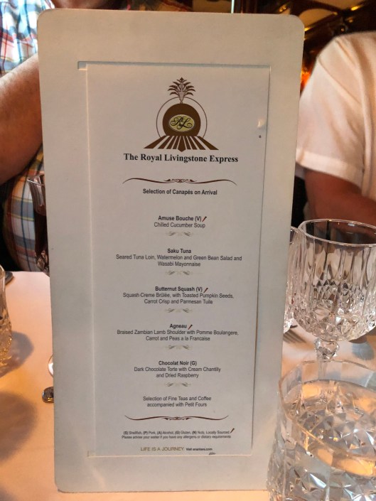 We came back to our hotel for a bit of a siesta before venturing out on the Royal Livingstone Express for an evening back in time. We boarded the steam train that was one of the original trains from when the railway was completed in 1905. We got a great history of the train and the bridge construction before we departed on the Cape to Cairo main track. We stopped on the bridge that Dale and I saw while we were visiting the falls on our first day.