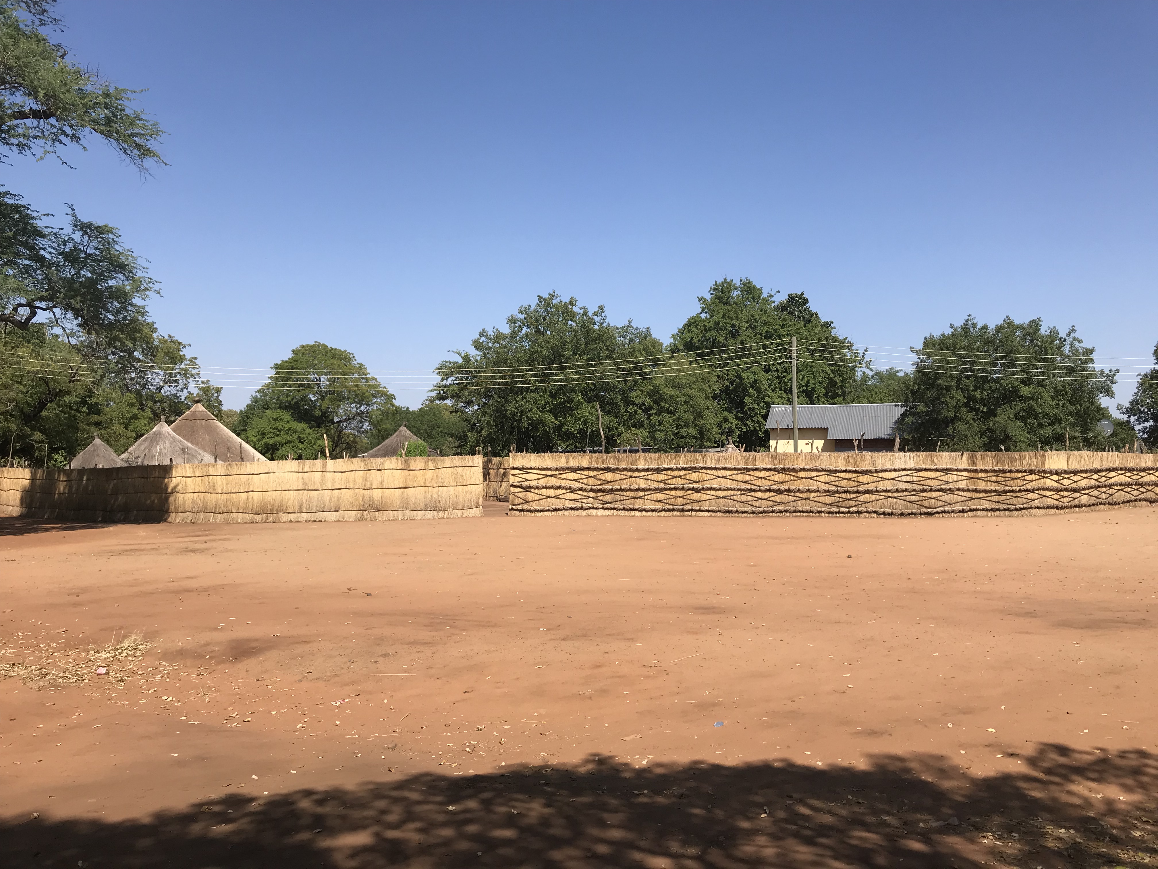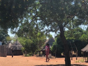 We then wandered around the village. Each family had several small buildings that were either for sleeping or cooking. The wood frames of the structures are erected by the men, while women do all the clay/mudding work. The children had a hut of their own and parents slept nearby. The buildings are round to facilitate snakes getting out. The have no internal lighting in the buildings so it is helpful to to know that, in a round room, the snakes who come in can keep going right on out. In a building with corners, they can get turned around and stuck more easily. The family compounds were surrounded by grass fences that looked sturdy. Its unusual for animals to come into the village because there are so many people and fires, however, the biggest concerns are with elephants who want to come through.