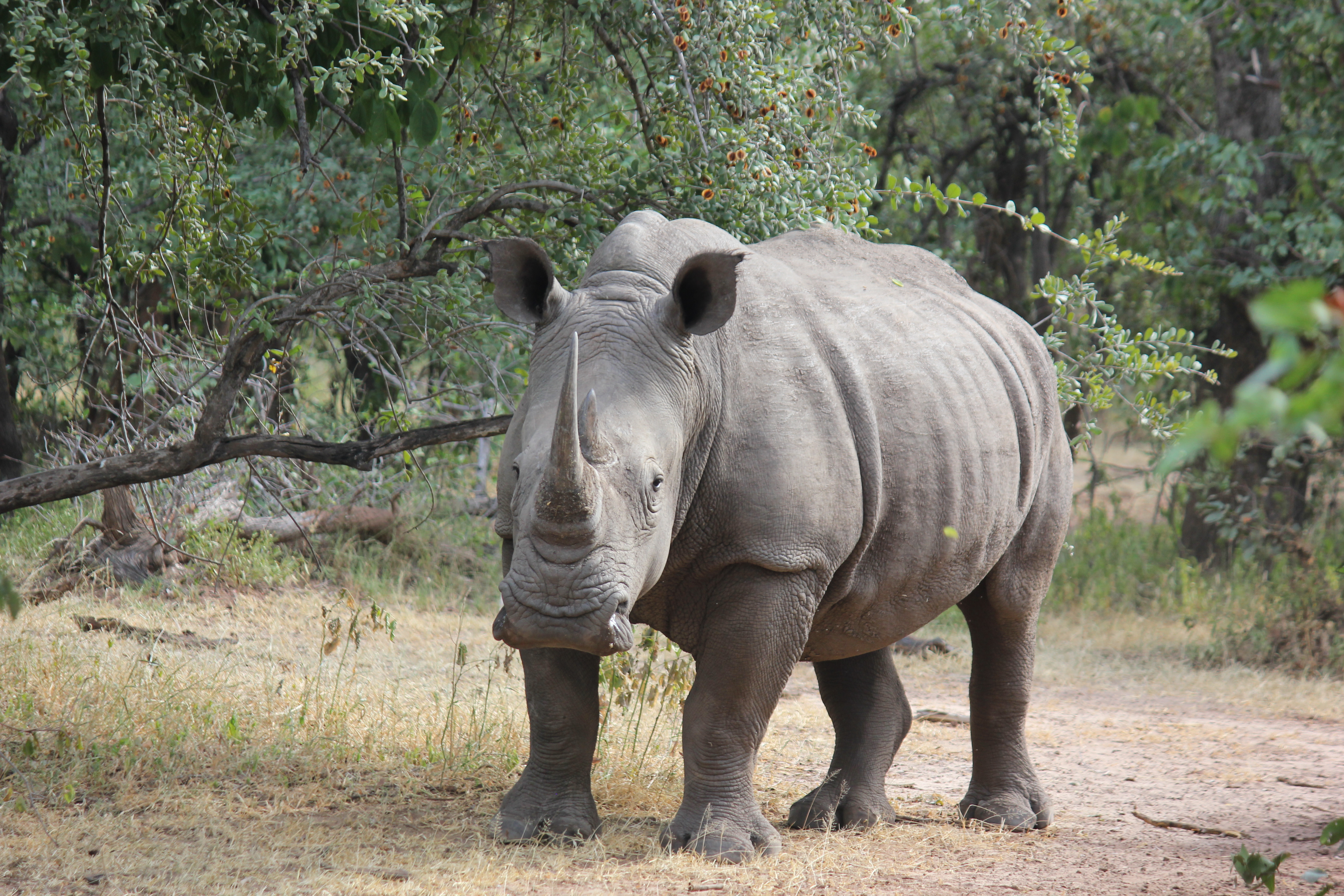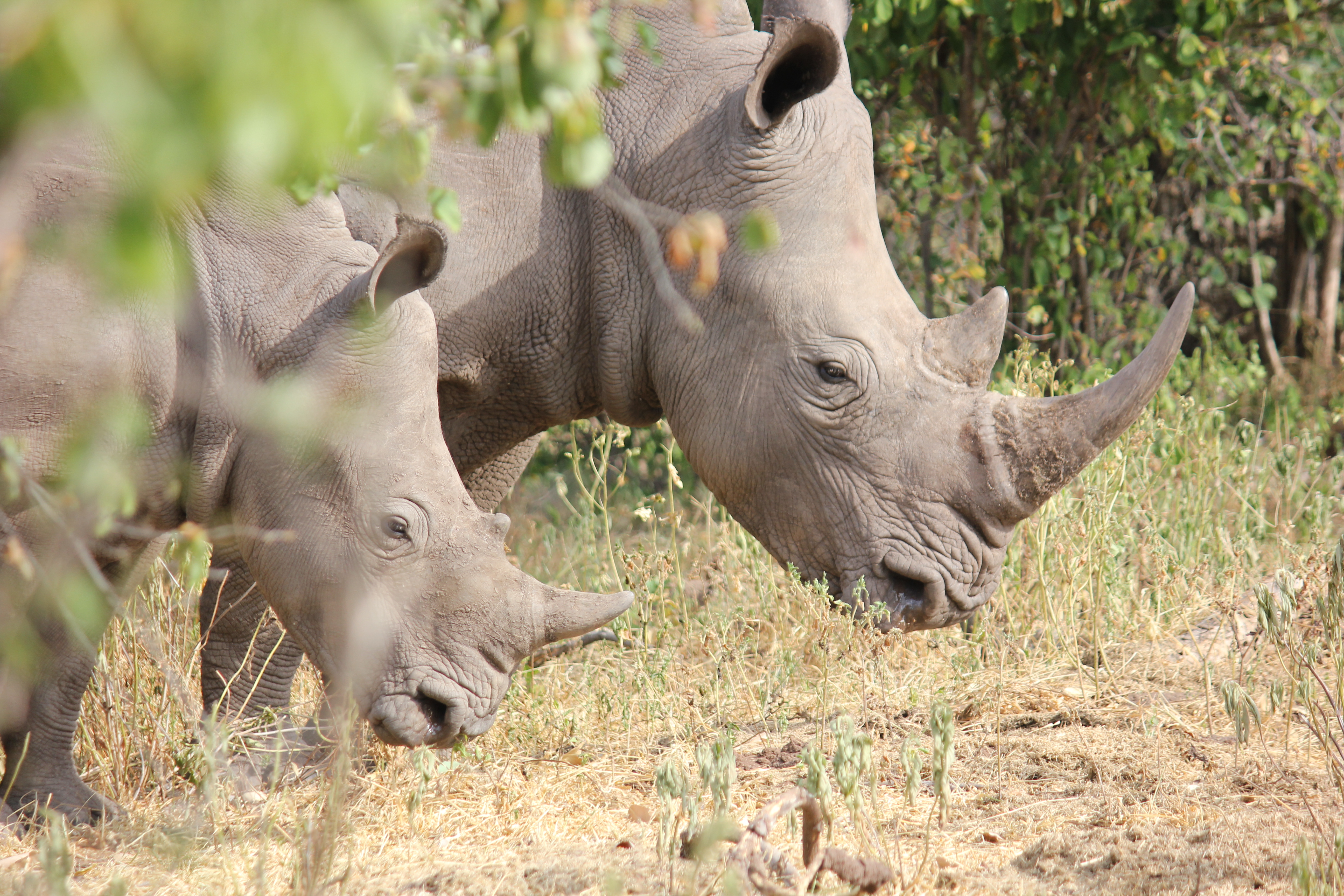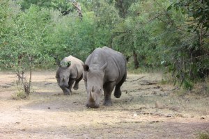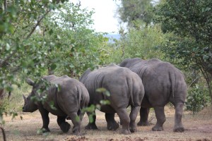 Our driver came to a stop at a small building in the middle of nowhere. He stated that we were now going to wait while the rangers got ready. Then a man and a woman methodically changed into walking gear, put their guns, i.e. Short automatic rifles, on their shoulders and climbed into the jeep. These were the rangers who were going to take us to the rhinos. Our instructions were to follow their instructions and walk slowly and quietly in a single file (to be less of a threat). We set off on foot into the trees following our guide (no pens in sight, we were in the wilderness). He took us to where he thought the rhinos were and there they were gone. He left us briefly and then waved to us to come quickly. We turned the corner and he waived me forward to take pictures. There were three rhinos, a mom and two of her calves, one from last year, one this year. The “little one” started moving quickly towards us and we were encouraged to back up and get out of the way.