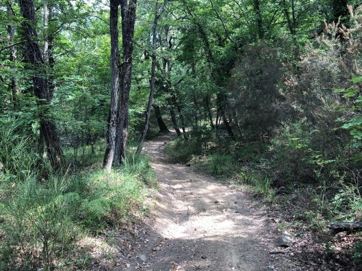 Our driver picked us up in Greve and deposited us on the side of the road of the “highest of the Chianti hills, Monte San Michel” so we could begin our trek into Radda. Our guidebook called this day an “easy” hike of 12km that should take 3 hours. It started with a delightful stroll through a forest. The path seemed to be the cut line for water and gas pipes. The path itself was small stones and sometime bedrock. The footing was challenging, especially going downhill, which was most of the initial trek.