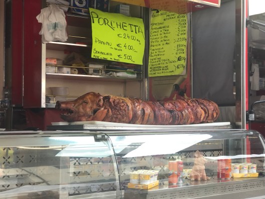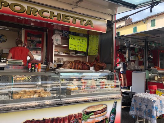 Before having lunch in the midst of the Saturday market. We were amazed at the efficiency of the “tear down” of the market at the end of the morning. We were particularly mesmerized by the whole roast pig being deconstructed as the market progressed