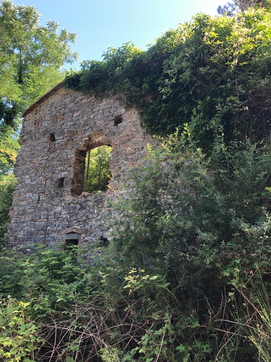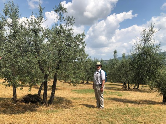 We went through fields, olive groves, vineyards and forests – all uphill. Then with some relief we started our decent. It was steep on scree-filled roads originally built by the Romans. Going down was harder than going up. I managed to fall and tweak my knee on a particularly steep portion. We will see how it feels tomorrow. We eventually came to a vineyard where we stopped for lunch.