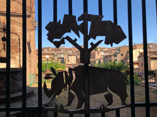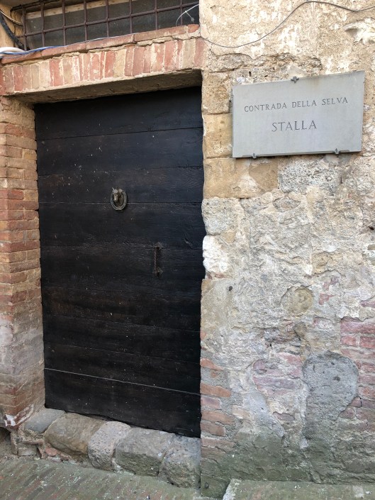 This is the symbol of the forest Contrade. They changed their animal symbol from the wild boar to the Rhino in 1512 when the first drawings of this mighty beast started arriving in Siena. The horses come into town three days before the race to practice and our houses in these tiny stables hidden down what used to be totally covered alleys.