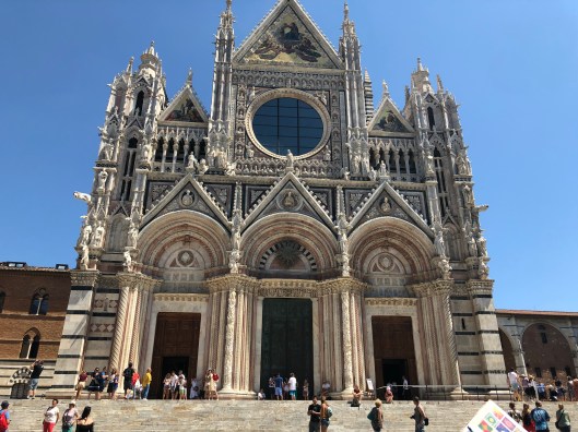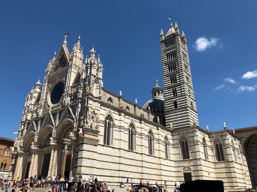 We continued past all sorts of touristic stores and restaurants as we walked through this old city. Siena was important in the Middle Ages as the stopping point from Rome north. The plague stopped in its tracks in 1348. It took several generations to recover and that showed in its loss of political/economic status and in its buildings. Recovery was seen by the time of the renascence.