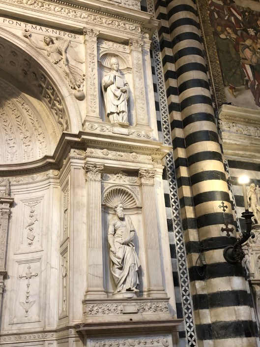 One chapel was designed by Bernini, one of our favourite sculptors. Another altar was designed and started by Michelangelo. He carved 4 panels before ditching the project for the more lucrative commission to sculpt the David in Florence. The statue he did of St Paul is believed to be his first self-portrait. If you stripped away the beard you might also see the face of the David.