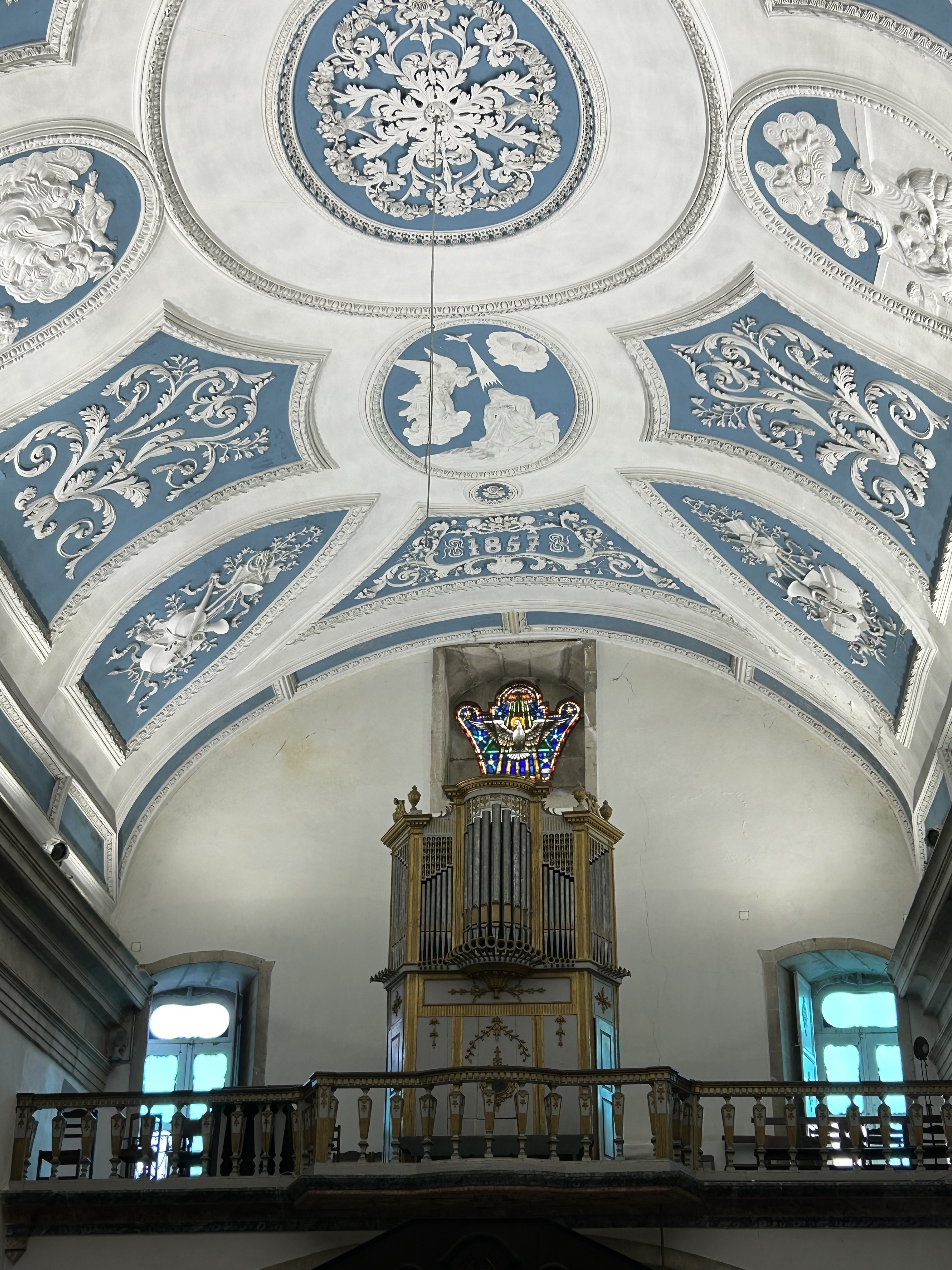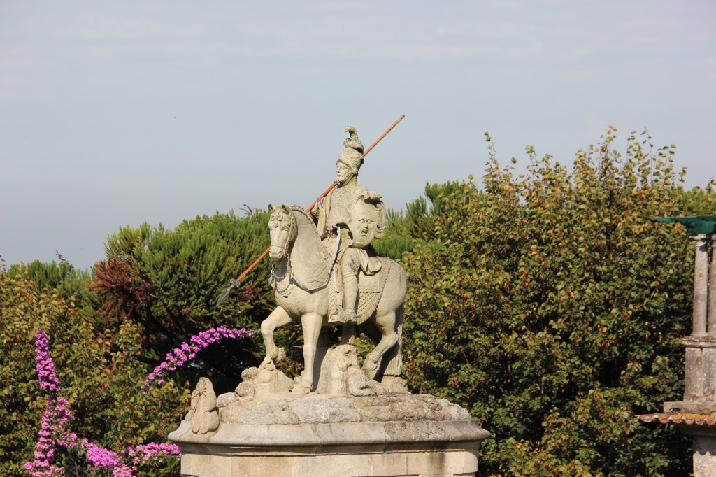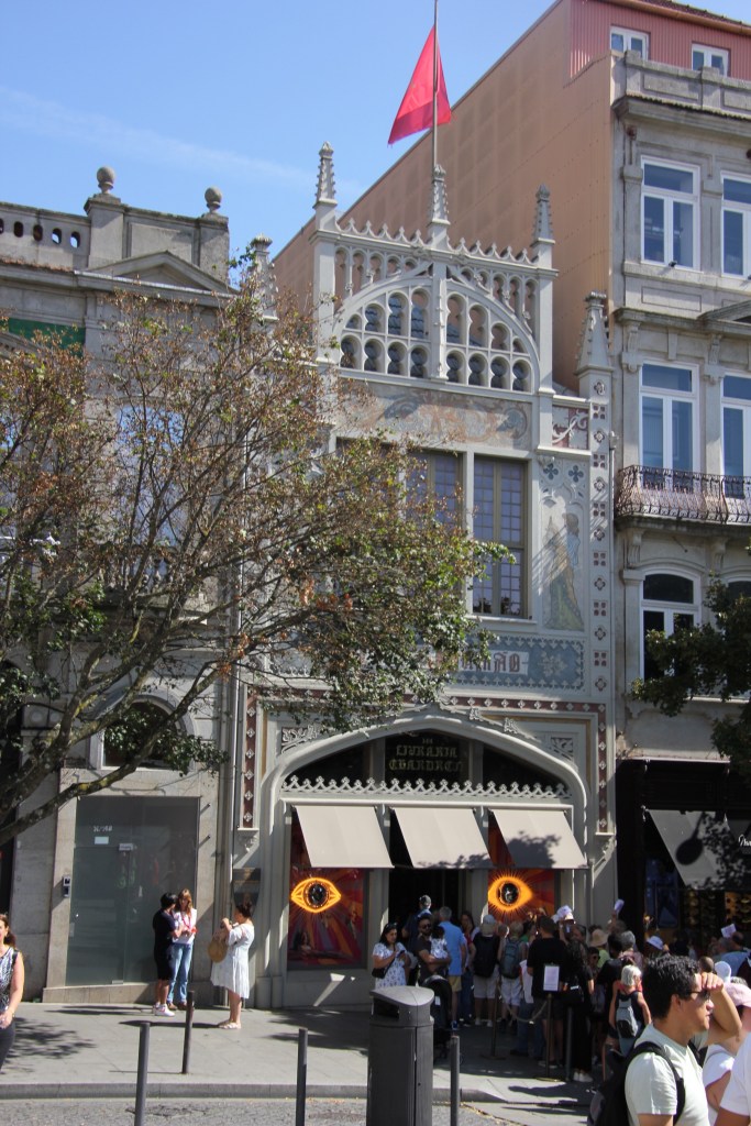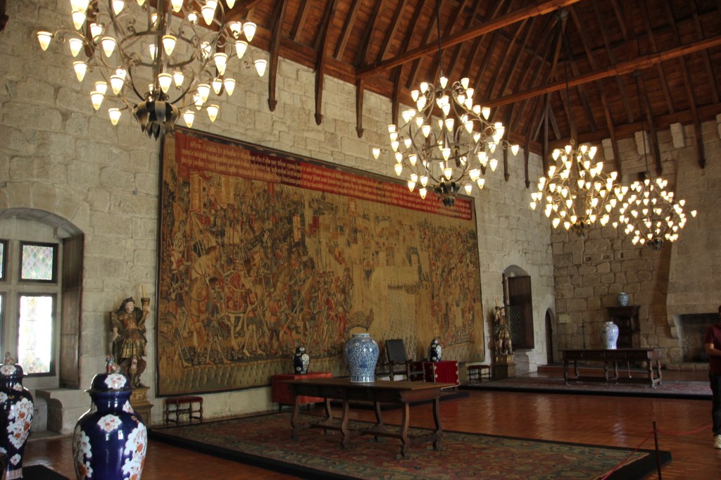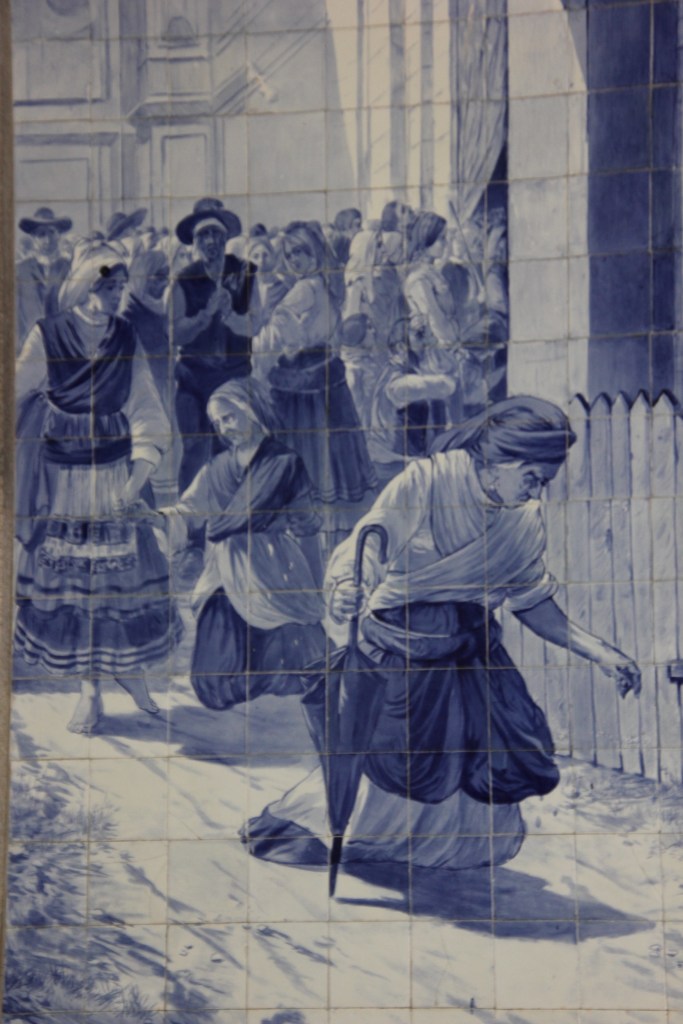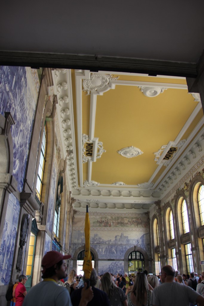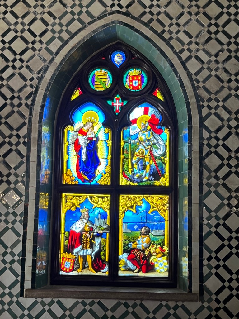 We appreciated learning the full story of the palace as we walked through the deliberately wild gardens. The calm of the gardens was a juxtaposition to the chaos of the crowds of the palace itself. Rui encouraged us to focus on the exterior and the story rather than the internal trappings of the Victorian era. The one interior we did explore was the chapel, original to Manuel’s time. It survived the earthquake of 1755 and remained as it was with the exception of the stained glass window. If you look closely at the chapel window in the pane with the king in front of the chapel , you will see the modern stained glass window in the chapel.