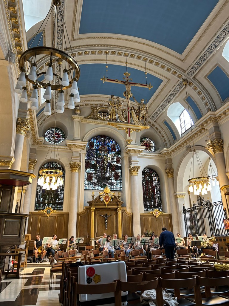 We then moved over to the Guildhall Gallery a few streets over. This brought us by the church we wanted to see yesterday. This time it was open. We stopped in to find a wind orchestra practicing. We listened a while and continued on our way.