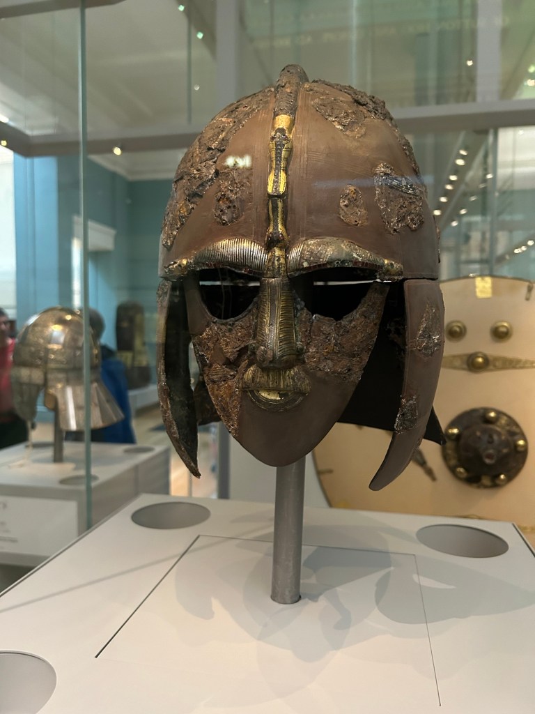 There is so much to see in this museum and after a couple of hours we know that sore feet and backs will kick in, so we decided to focus on specific collections. We had seen a movie a while back about the Sutton Hoo Hoard, so we thought we’d focus there. The Sutton Hoo Hoard was found just as WWII started. Basil Brown, an amateur archeologist was tasked by the land owner, Edith Pretty, to excavate a barrow on her land. They found an incredible and rare, intact Anglo-Saxon boat burial. Gold, gems, lyres, helmets and the remains of a large boat were under what looked like a small hill. The hoard is housed at the museum and it was amazing to see the goods they had buried sometime between 410-1000 AD. They had incredible metal and fine metal working skills.