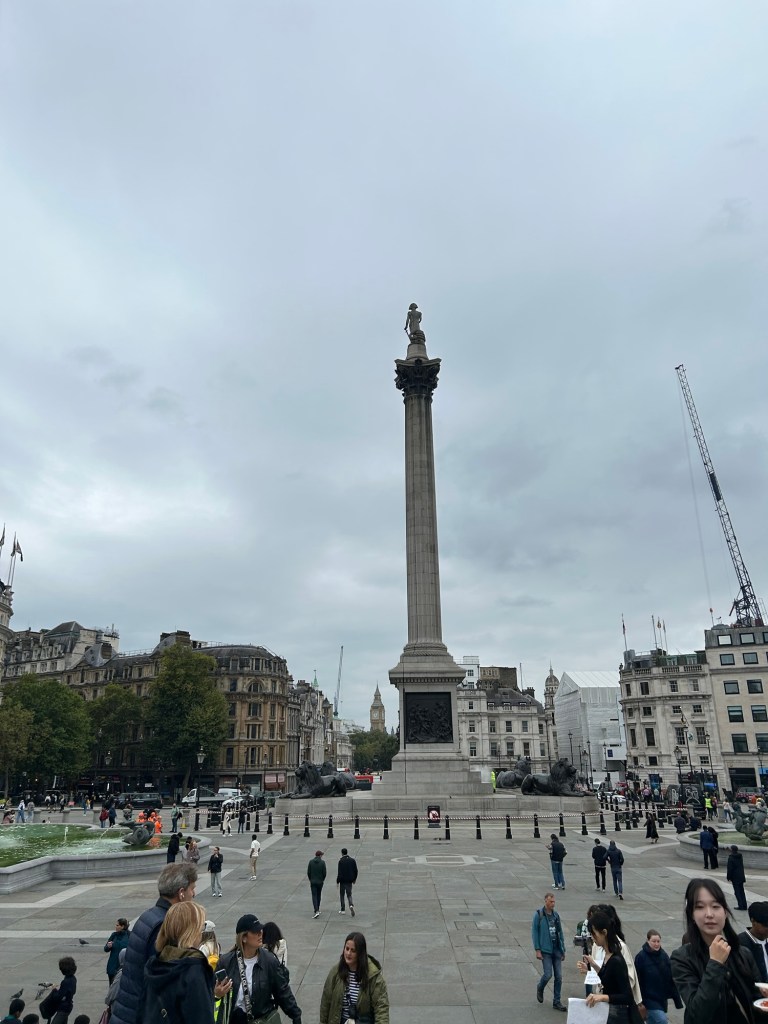 We started our day by crossing the Thames and taking the Northern Line to Charing Cross. This is considered the “centre of London” and it is from there that distances from London are measured. It was clearly a busy place and we easily moved off to Trafalgar Square, the home of a statue to Lord Nelson celebrating a win at the battle of Trafalgar in 1805.
