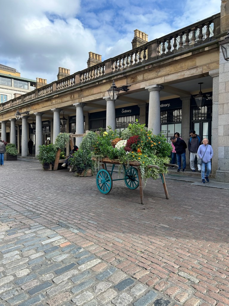 We left the gallery to head toward Covent Gardens. Covent Gardens was originally a garden for West Minster Abby, but after the dissolution of the monasteries, the land was given to Henry VIII’s advisor, the Earl of Bedford. He hired an architect to develop the land into homes and markets. By 1654 a small fruit and vegetable market was developed. As time went on, the market became seedy with lots of brothels. The clean-up began and by 1830, many of the buildings that we now see were built. Now it is a trendy group of small shops and restaurants. We stopped at the Punch & Judy Pub for lunch and continued to explore the market.