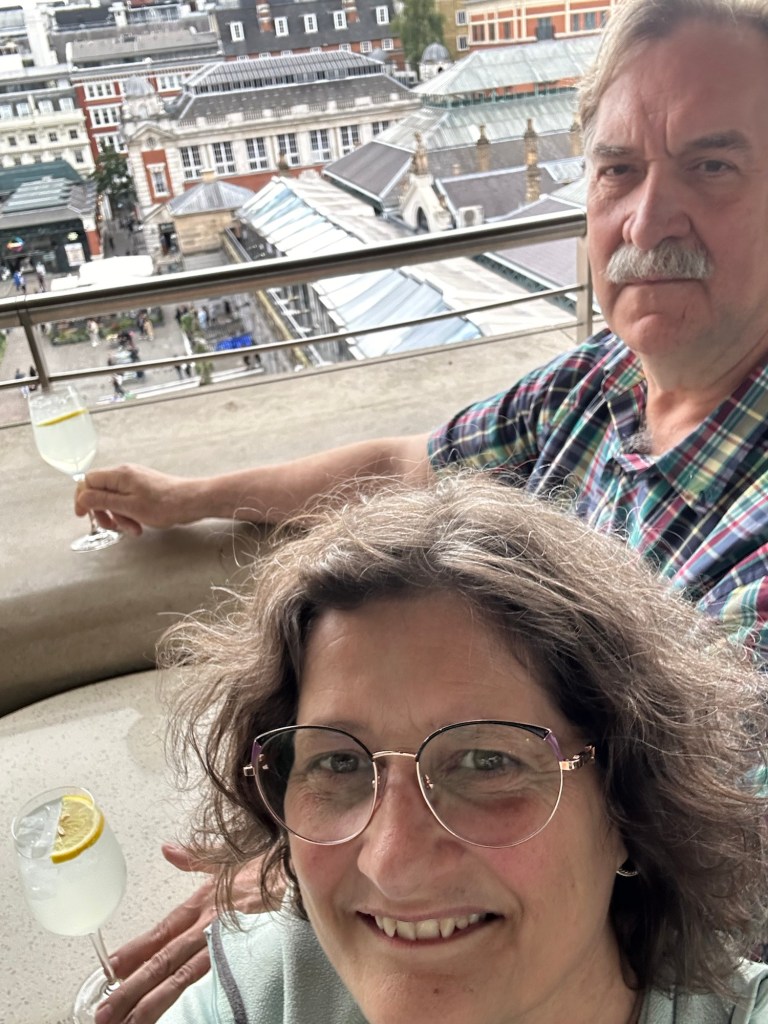 The ever so wise Facebook logarithm strongly recommended we check out the Royal Opera building, so we did. The building is relatively modern having been constructed in 1858. We looked around the common areas but couldn’t see the stage as they were getting set up for a performance tonight. We did find the 5th floor viewing area/bar and stopped for a beverage while overlooking Covent Gardens. A wonderful musician serenaded us from below singing jazz standards and playing them on his saxophone.