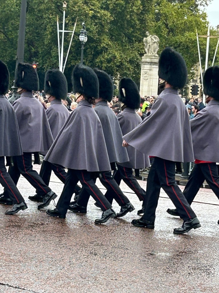 We set out to walk to our first stop and found ourselves at Buckingham Palace just at the time of the changing of the guard. We hadn’t planned to take this in, but who doesn’t love a good parade? The weather was cold and rainy so the guards were wearing their cloaks, so it was a fairly unimpressive parade.
