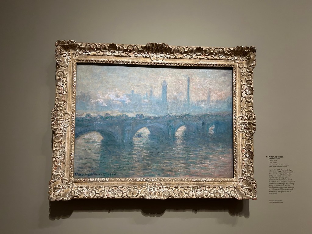 We have been avid fans of a British show called Fake or Fortune for a couple of years. On this show, Philip Mould (a high end art dealer) and journalist Fiona Bruce (who also hosts the British Antiques Roadshow) try to figure out whether a specific work of art is either real (and worth a fortune) or fake. They often enlist the efforts of art conservationists from the Courtauld Institute to help them. We decided it would be fine to check out both Galleries. The public gallery at the Courtauld is open to the public free of charge. However, we bought tickets to a special exhibit of Monet’s paintings of London that opened today. Monet visited London several times and seemed to love painting the bridges of London enveloped in fog. He started hundreds of canvases but only finished 37. He did a successful exhibition of them in Paris which resulted in many being sold, distributing them world wide. This was the first time 21 of these paintings have been gathered together to be shown in London in 125 years. One of the paintings was actually loaned for the exhibit from our National Gallery in Ottawa.
