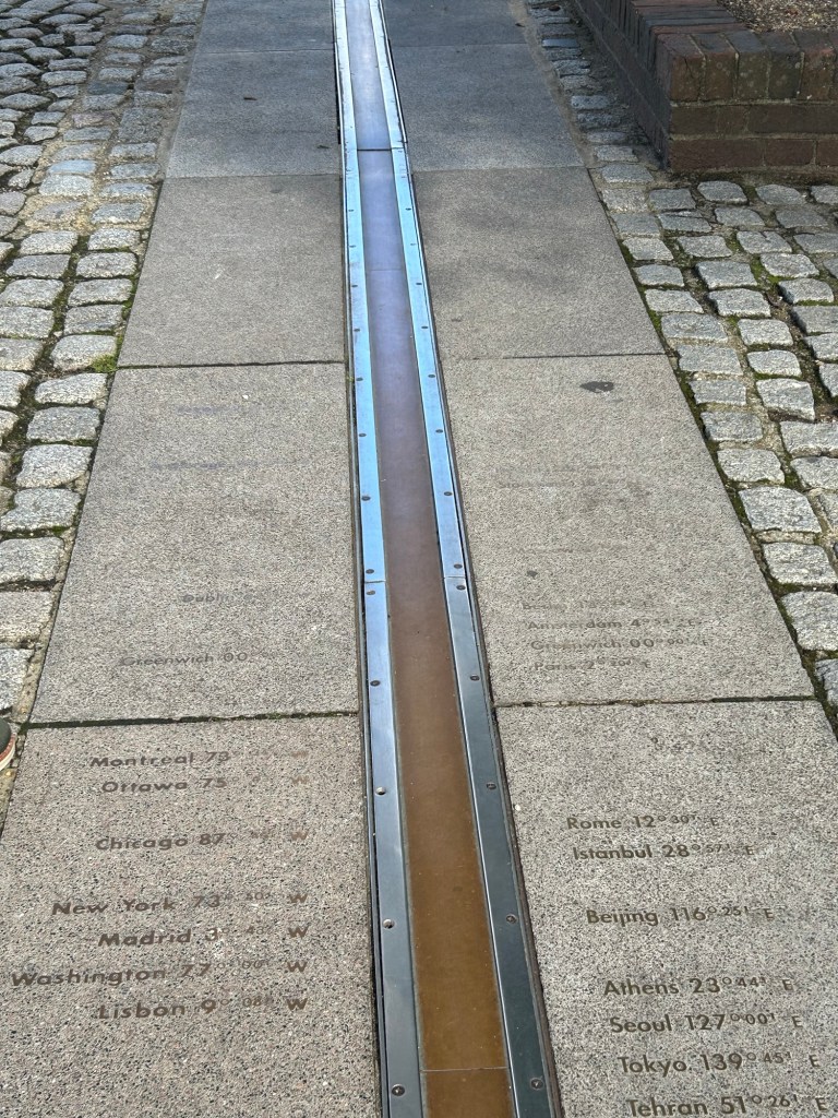 We got off at the Greenwich Pier and, after consulting with the information booth lady, started our uphill climb to the Royal Observatory. We realized it was the first hill we have actually seen in London. The observatory is in a large park that was rife with children and dogs. It was obviously a day for families to be out and about. The observatory was built in 1675 by Christopher Wren. John Flamstead was the first Royal Astronomer . He was instrumental in building the British/western world’s understanding time and space. He introduced the concept of meridians (aka, lines of longitude). As Britain was expanding its empire, the need for sailors to have a reliable sense of time became more important. A meridian (in case you have forgotten) occurs every 15 degrees around the globe (I.e., 360 degrees in a full rotation divided by 24 hours per day= 15) and represents one hour. George Airy, the 7th Astronomer Royal determined the prime meridian and because most ships were using navigation charts based on that line, it was declared the prime meridian by international convention in 1884. The prime meridian separates east and west in terms of time.