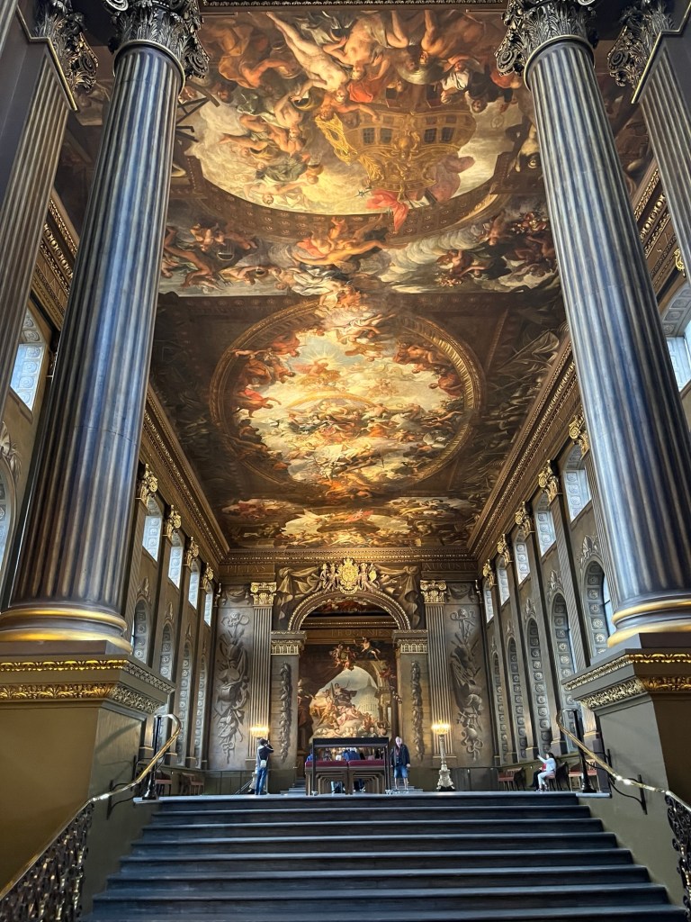 After a delicious lunch on a patio (despite it being only 15C), we were off to our next stop, The Painted Hall in the Royal Naval Academy. What started out as a blandly decorated dining hall for veterans of the British Navy, turned into what the guide called the British Sistine Chapel – minus all the religion. The building housing the hall was one of the four on this site built by Christopher Wren. Apparently he built everything in London after the fire.