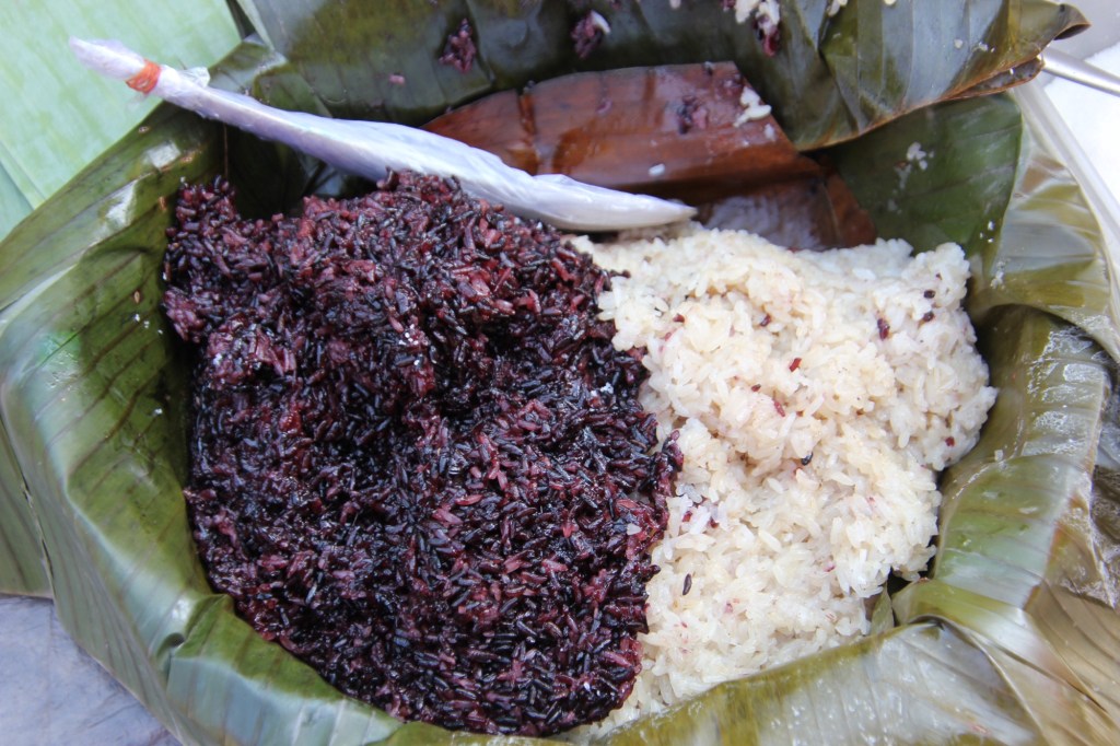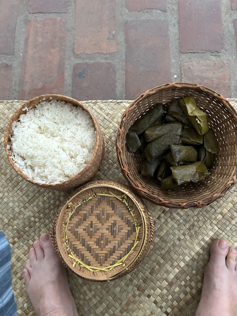 We sat on stools with baskets of sticky rice and Laos food wrapped in banana leaves. As the monks and novices walk by, we put a gloved handful of sticky rice and the wrapped food in their bowls, one after another. These monks come into town from a rural area to gather food to bring back to their communities, not just for the monks but for others who have need.