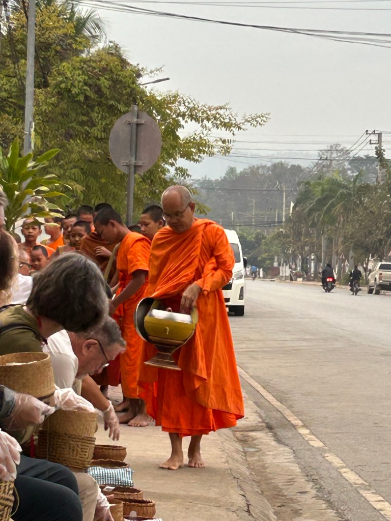 We started our day today before dawn. We left the resort at 6:15 and drove to town to give alms to the monks, a practice called Tak Bat. Our guide Dome described the process beautifully and I quote him here: