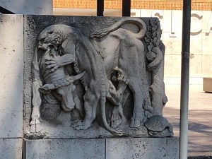 Today we set out to find our conference and get oriented to our part of Rome. The Sunday session of the conference looked like it was a short walk from our apartment so we headed out on foot. That is when we learned that the instructions left a lot to be desired. It was smoking hot as we walked around the entire walled site of the private university. Who ever heard of putting a whole university behind a wall and locking it up on the weekends? When we were at the point of giving up, a woman asked us if we were looking for the conference. She escorted us to a beautiful building and we were able to register. Actually, Karen could – they didn’t have my name badge. It was a total confusion. We decided to let it all go and head back to finishing up the last pieces of our presentations. We passed this image as we left campus outside the physics building.This would be a bit of a disconcerting an image as one went into write an exam.
