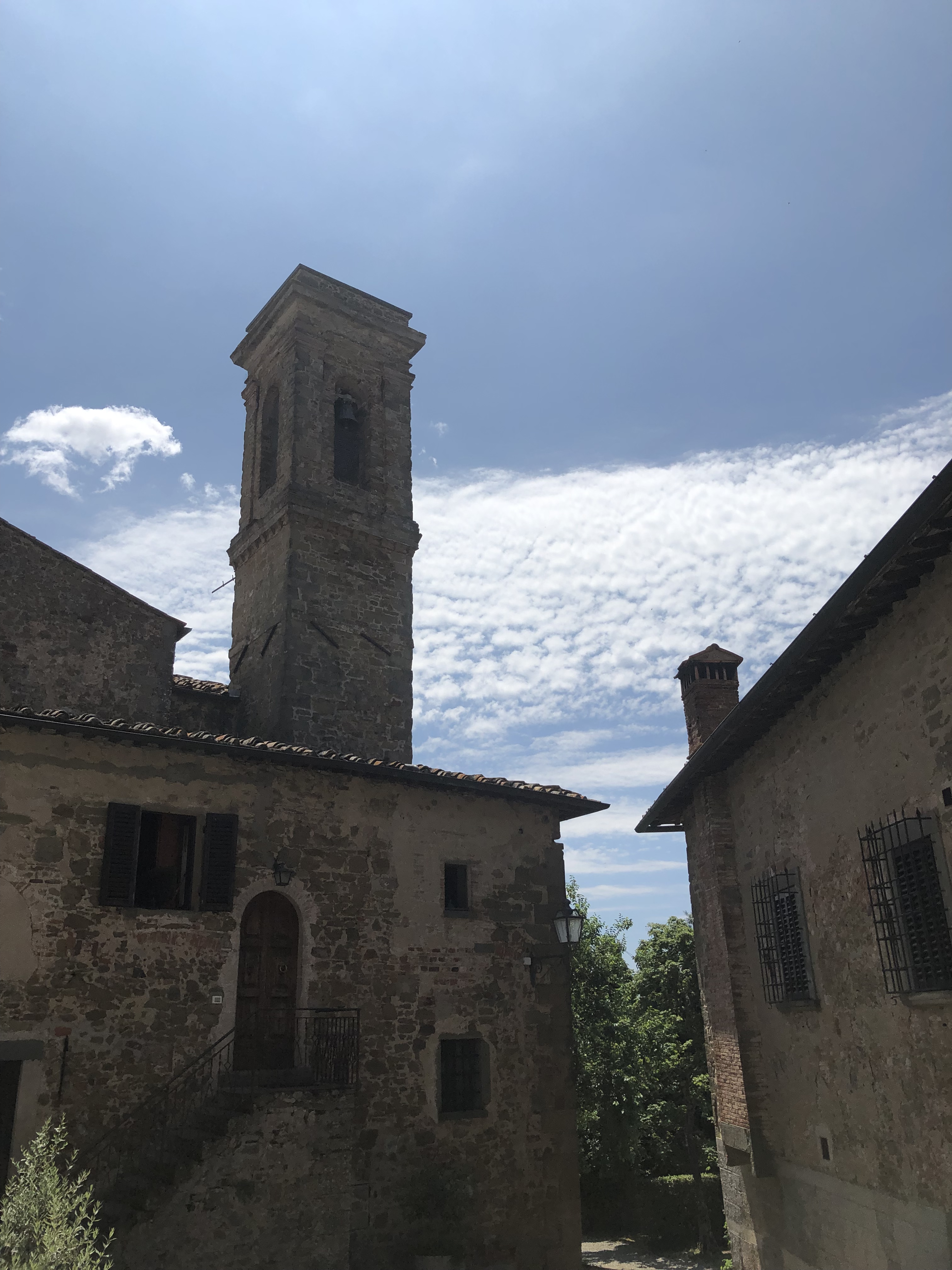 We stopped for lunch in Volpaia. It is a small village focused on wine and olive oil. We chose The Bottega for our meal as it had a commanding view of the countryside. The restaurant was attached to the church on one side. There was a bakery attached to the church on the other. It was a very good use of very old buildings. Everything looked like it had been there a long time, likely, according to the sign on the castle on the square, since 1176.