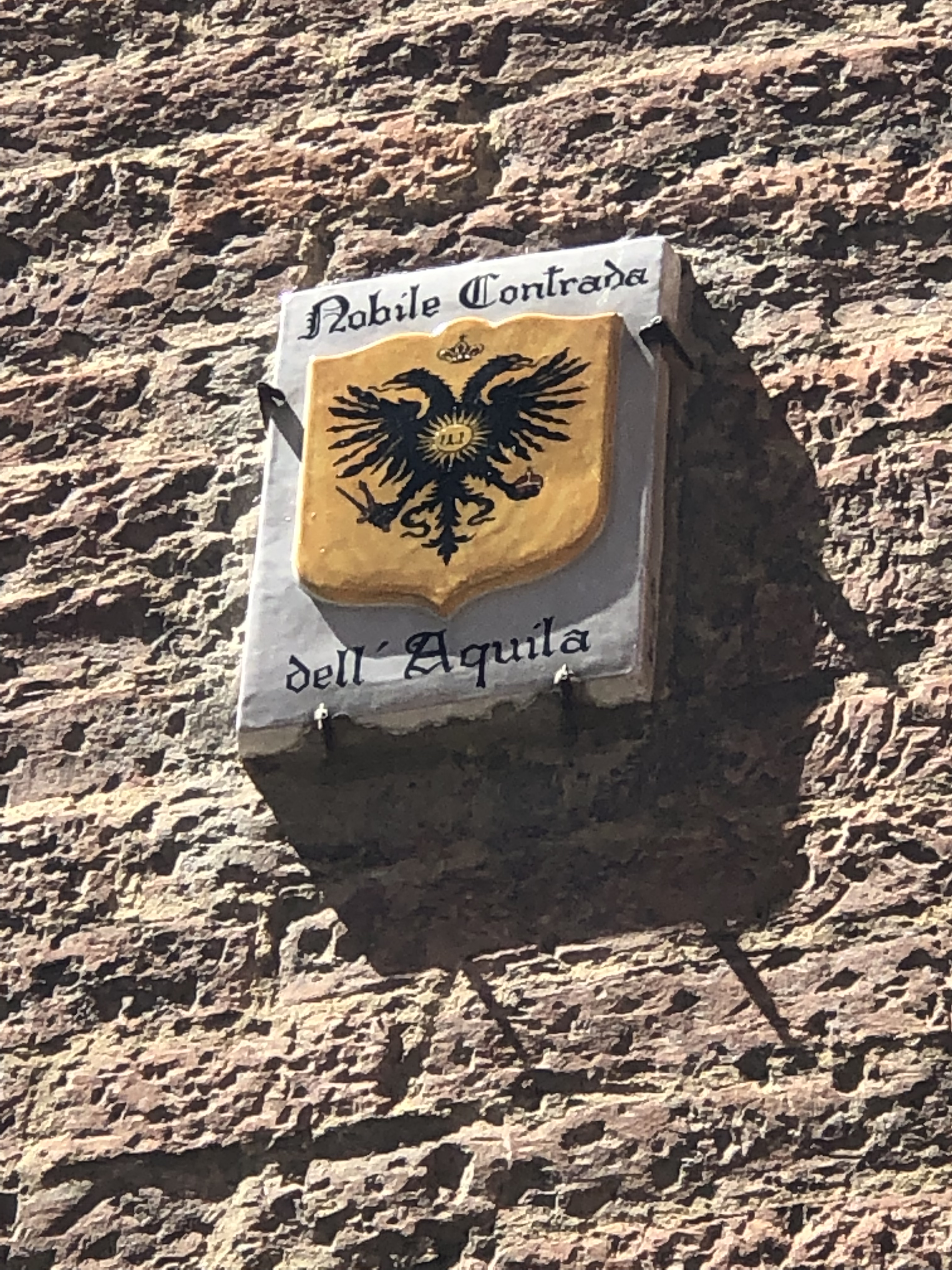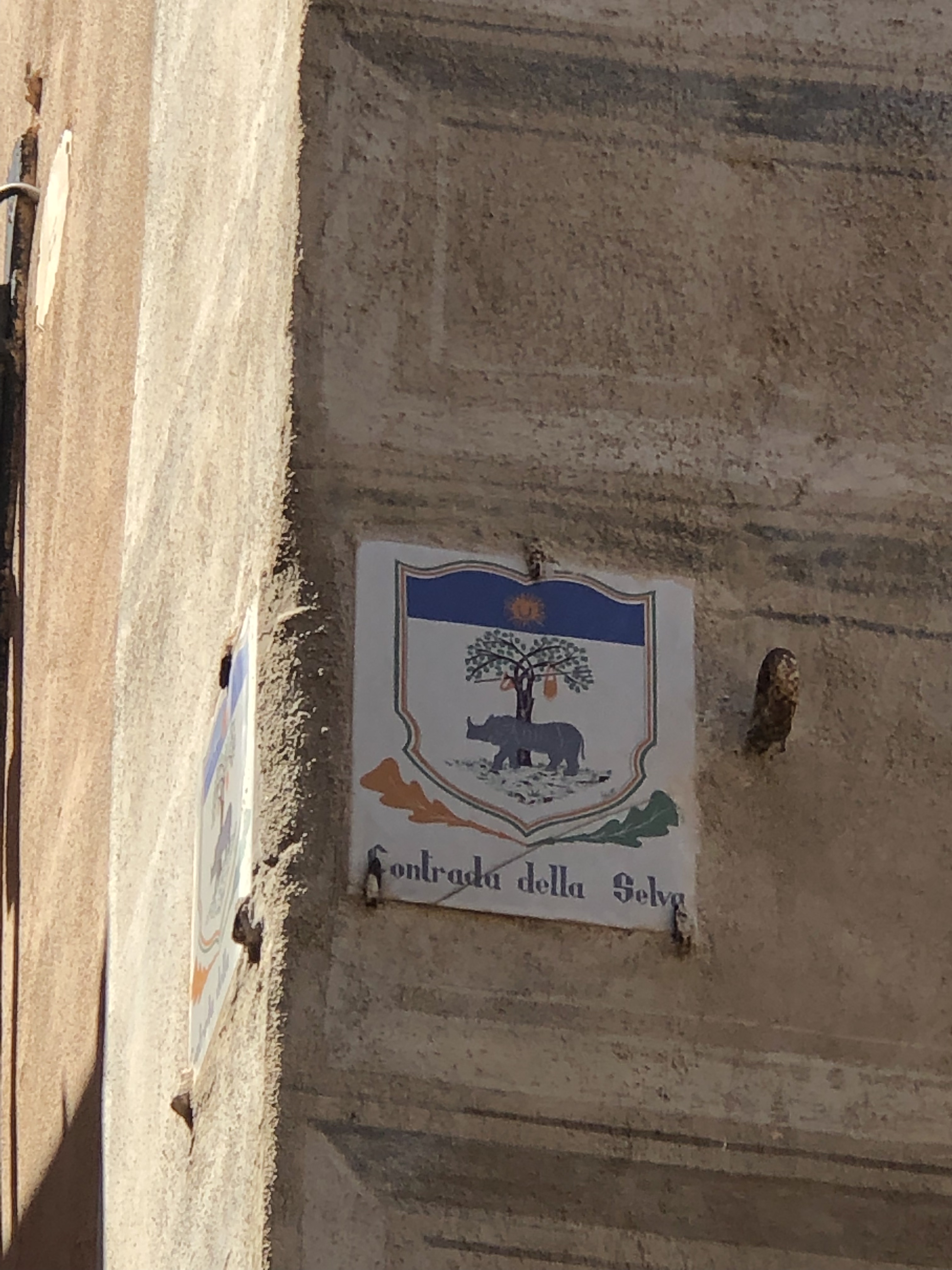 Each Contrade has an official colour and animal. We noticed plaques as we walked that told us which Contrade we were in.
