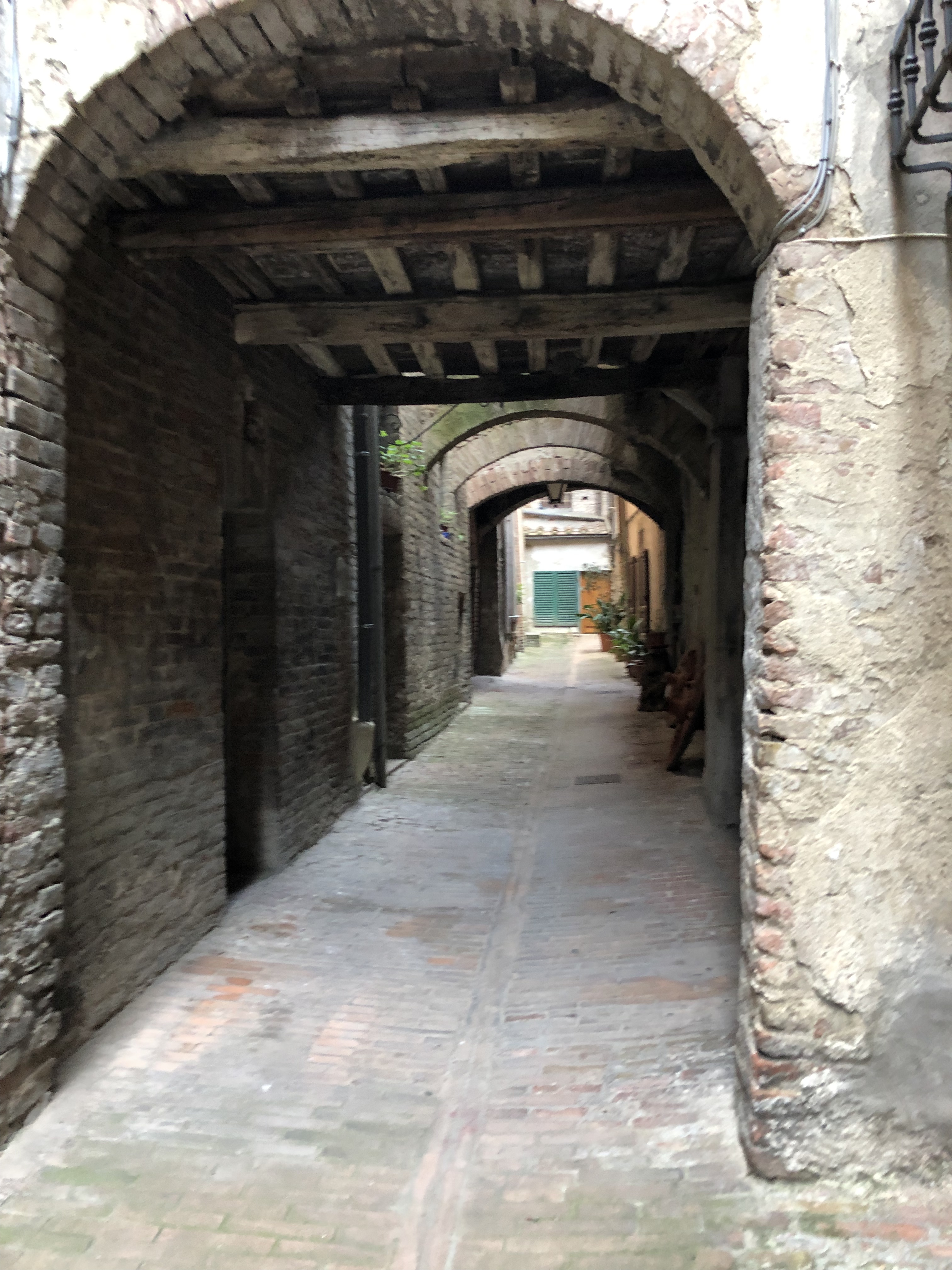 We continued past all sorts of touristic stores and restaurants as we walked through this old city. Siena was important in the Middle Ages as the stopping point from Rome north. The plague stopped in its tracks in 1348. It took several generations to recover and that showed in its loss of political/economic status and in its buildings. Recovery was seen by the time of the renascence.
