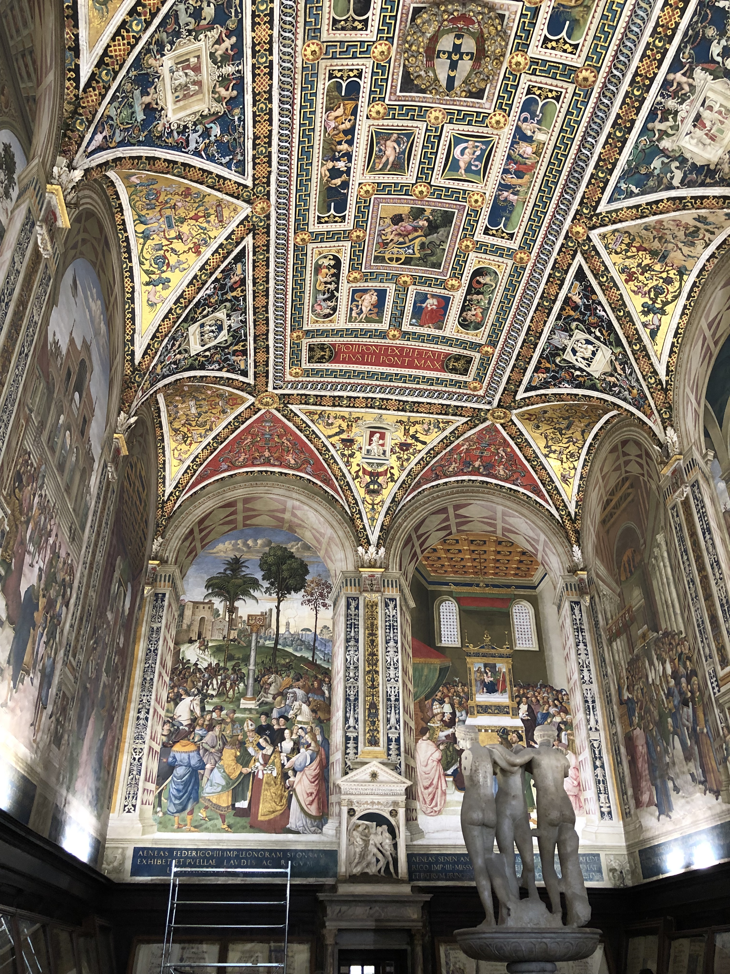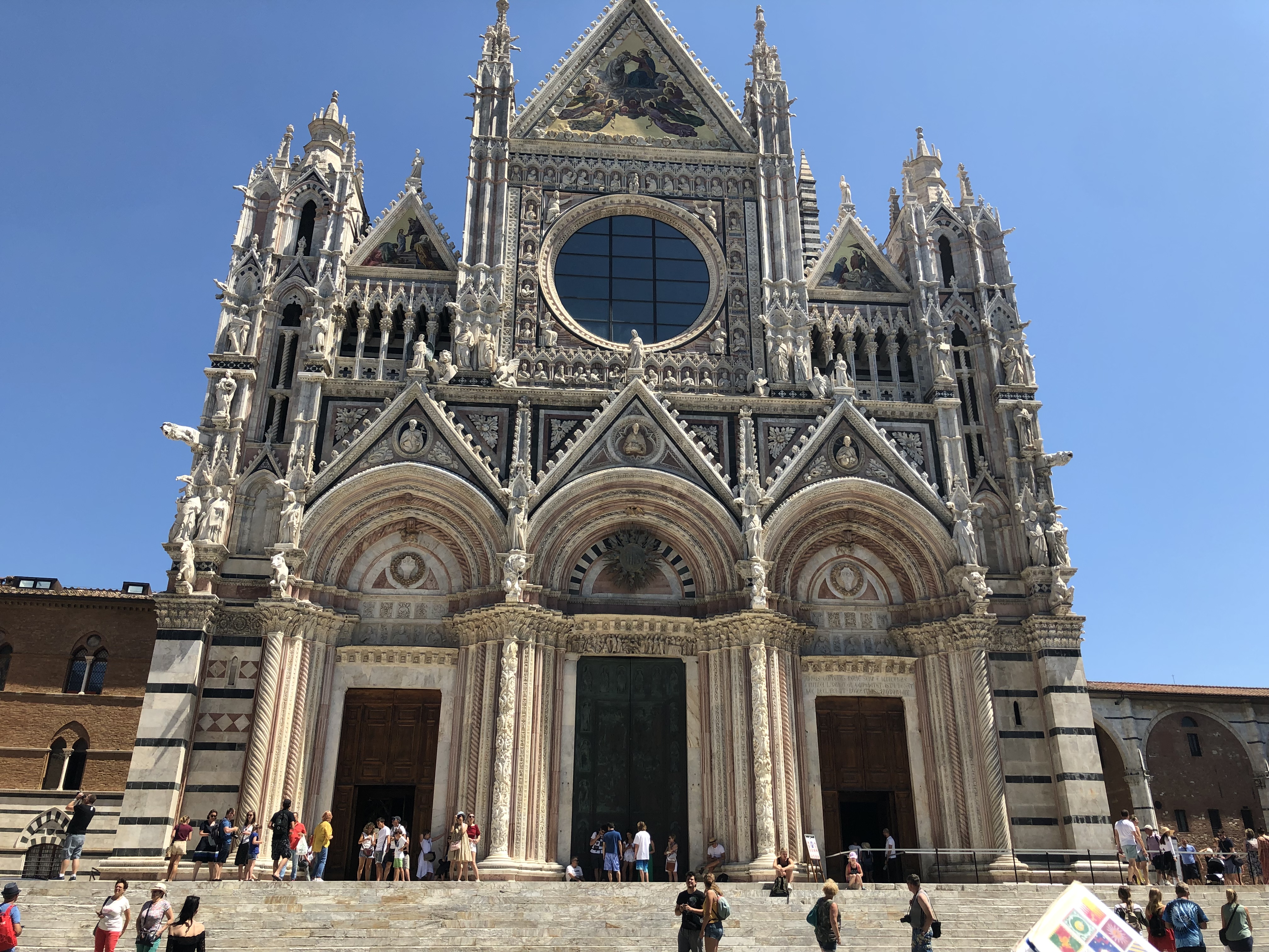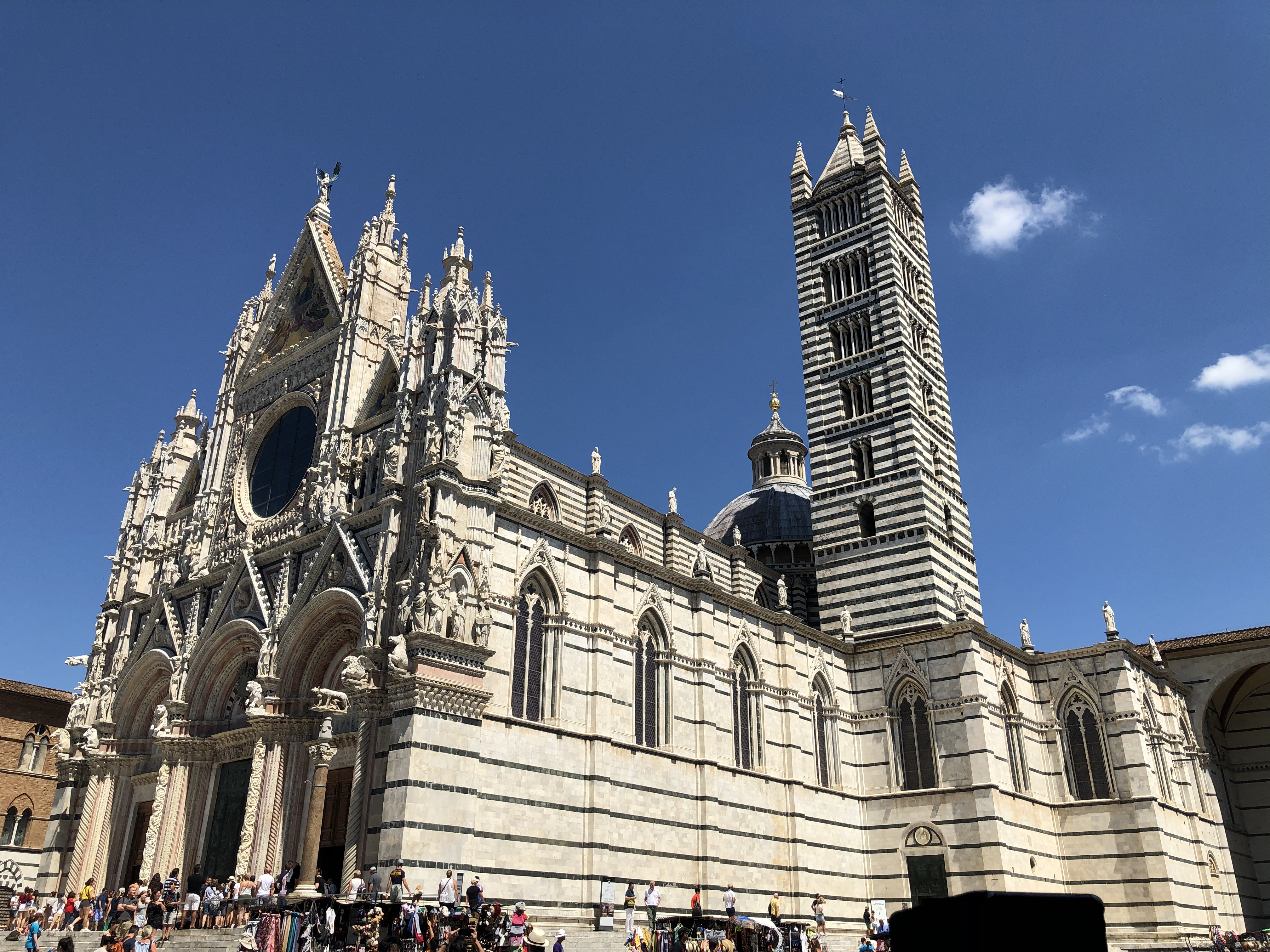 We started our walking tour here. Alice, our guide, told us that Siena is divided into 17 communities (Contrade) who compete in the Palio. This is a madcap horse race held twice every summer. It occurs in the square. They put down a sandy clay surface and let the bareback riders run the race. The horses matter more than the riders as it is the first horse across the finish line, without without rider. https://www.italyscapes.com/events/tuscany/siena/historical-reenactments/palio-di-siena-palio-di-provenzano-2019/