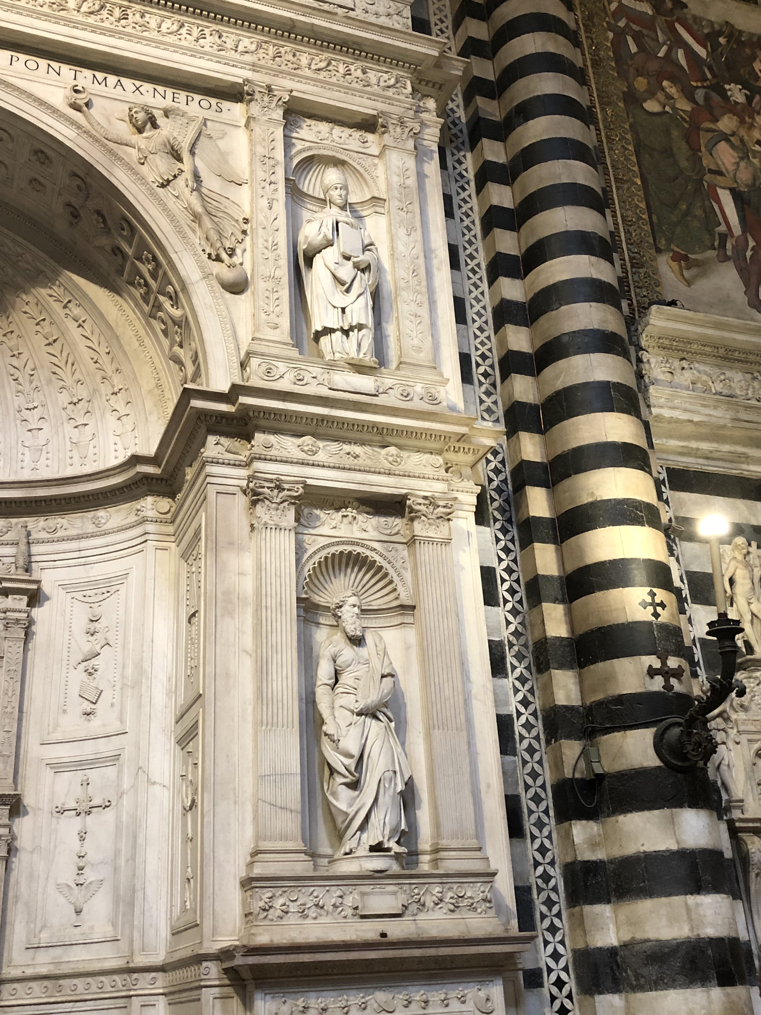 Another altar was designed and started by Michelangelo. He carved 4 panels before ditching the project for the more lucrative commission to sculpt the David in Florence. The statue he did of St Paul is believed to be his first self-portrait. If you stripped away the beard you might also see the face of the David.