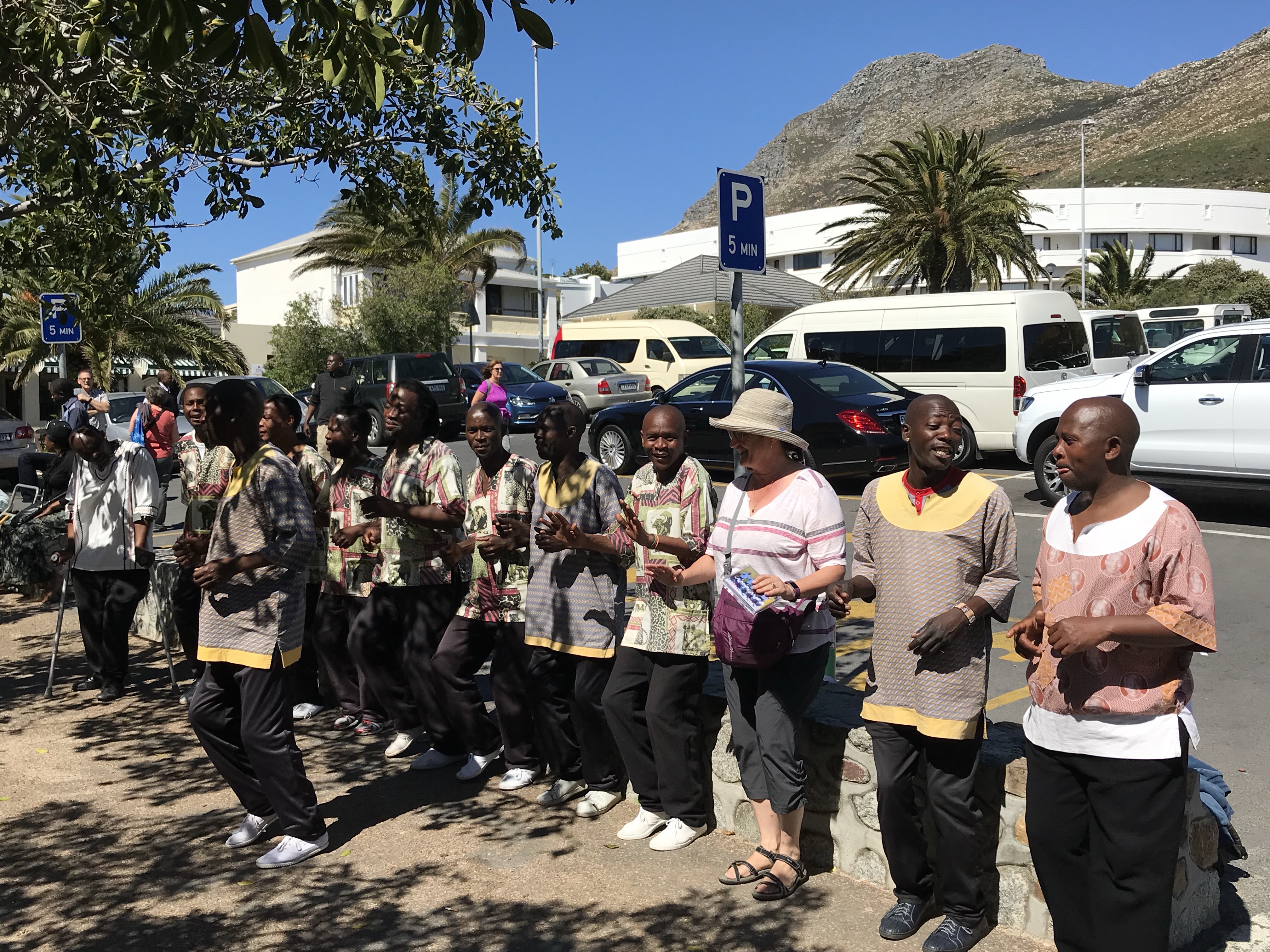 It was the mist from Victoria Falls. We landed and stood in line for an hour to get a visa that would allow us to travel to Zimbabwe and Botswana should we choose. Then our cab driver, Ali took us into town. This community was much more European (read lots of strip malls on the main road) than Tanzania. We reached our hotel, which is in a protected park. The families of giraffe and zebra we passed as we entered the grounds ignored us. these guys greeted us with song and dance.