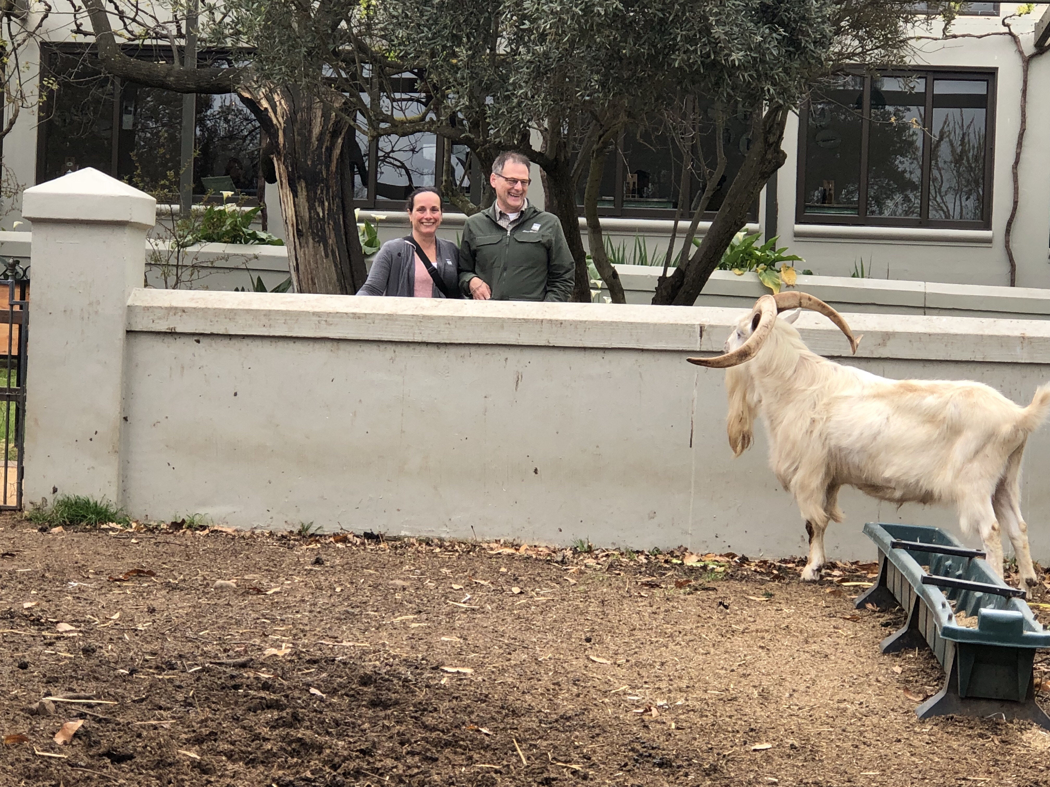 It came complete with live goats outside. Our third stop was the Rickety Bridge vineyard where we had lunch. The vineyard was one of the older ones around and was very good. Our final stop was a new vineyard, just 20 years old where we had a wine and chocolate pairing.